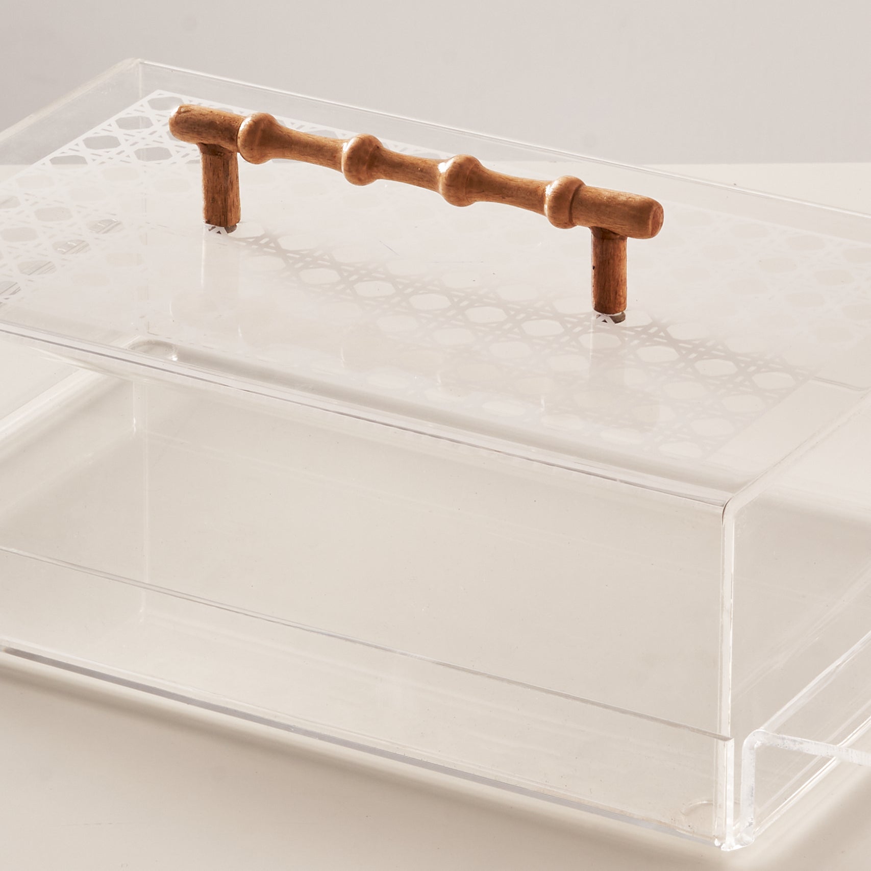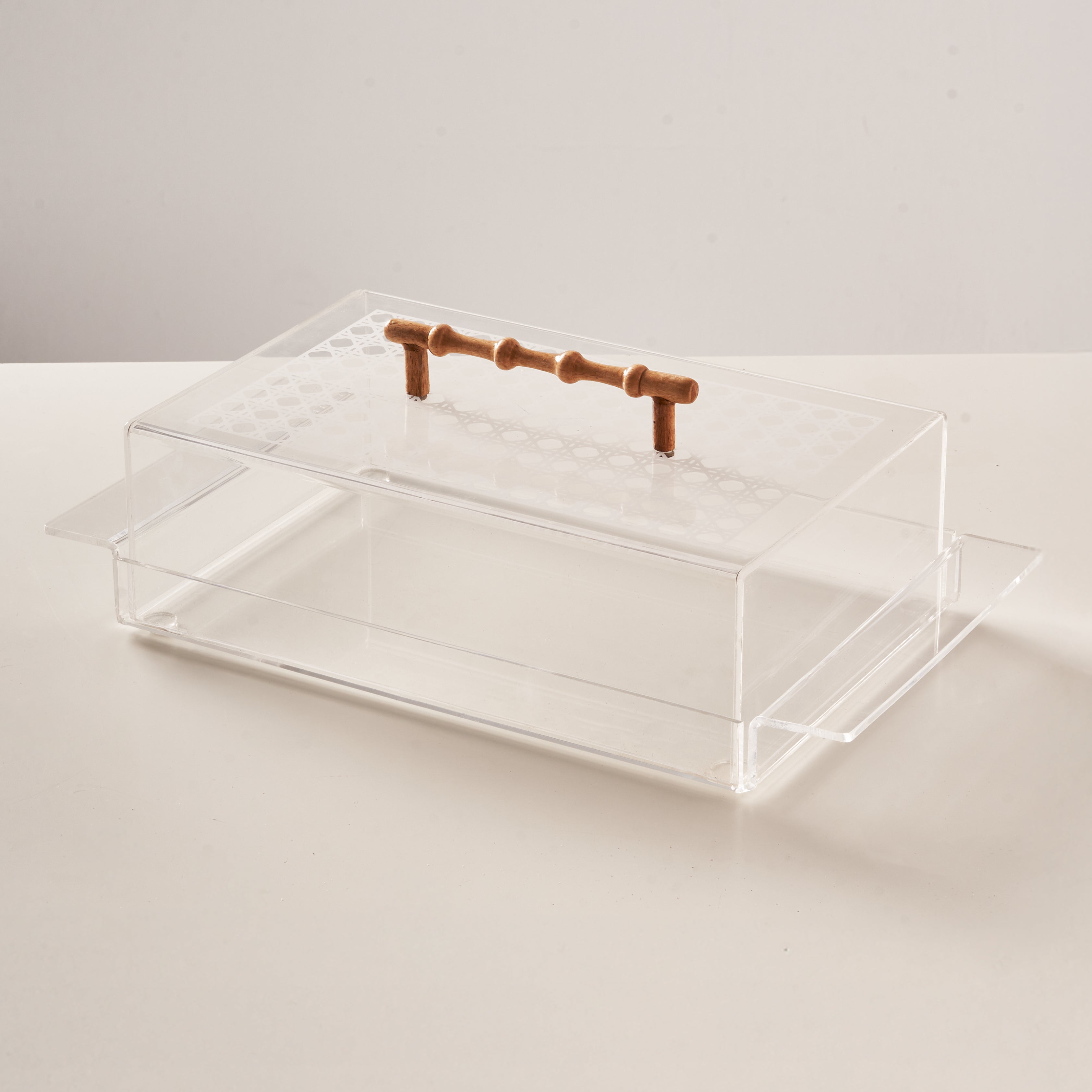 The Bambuā Covered Serve Tray combines functionality and refined design in one beautiful piece. Crafted from clear acrylic with a cane-patterned base and finished with our signature bamboo-style wooden handles, this tray comes with a fitted transparent cover—perfect for keeping food protected while serving in style.