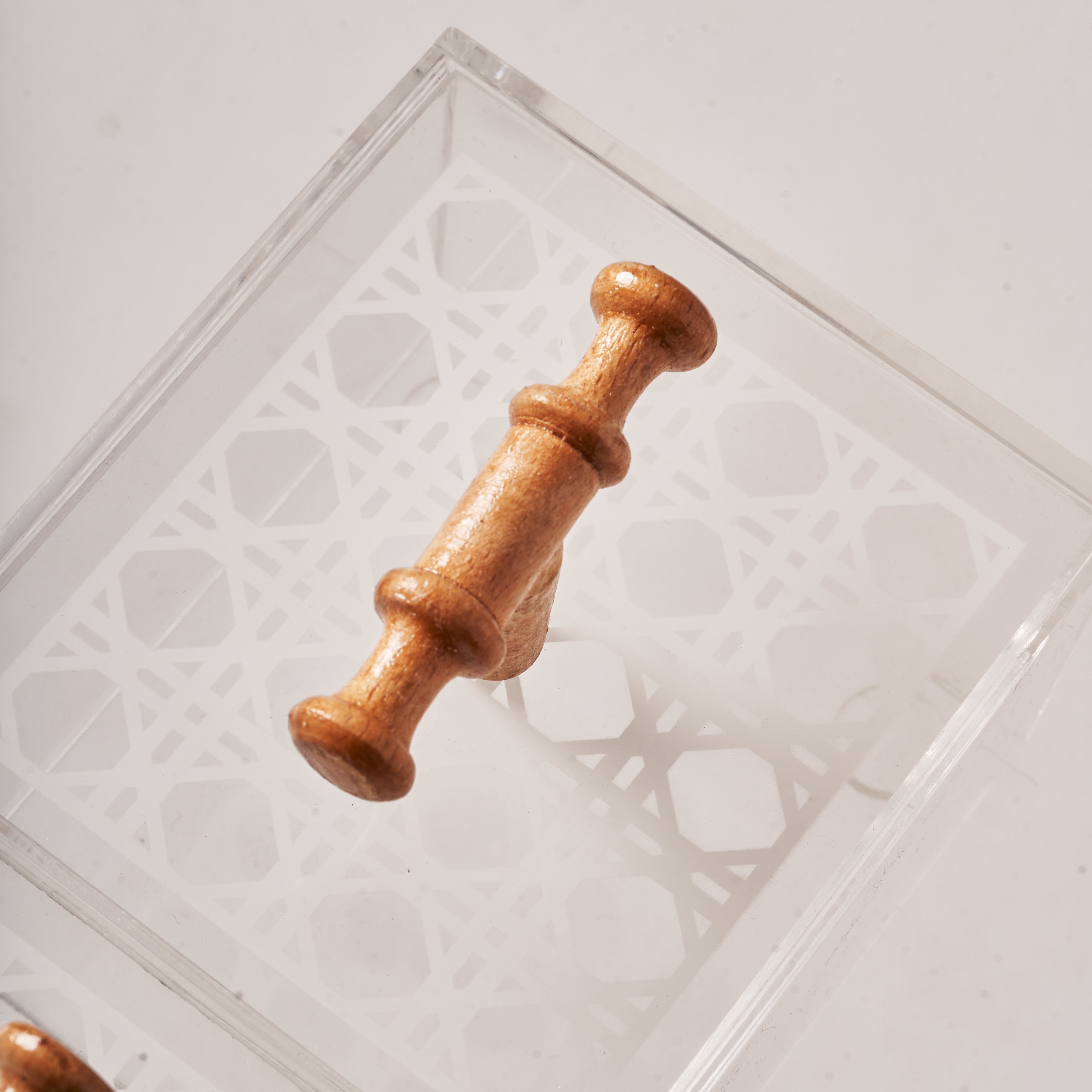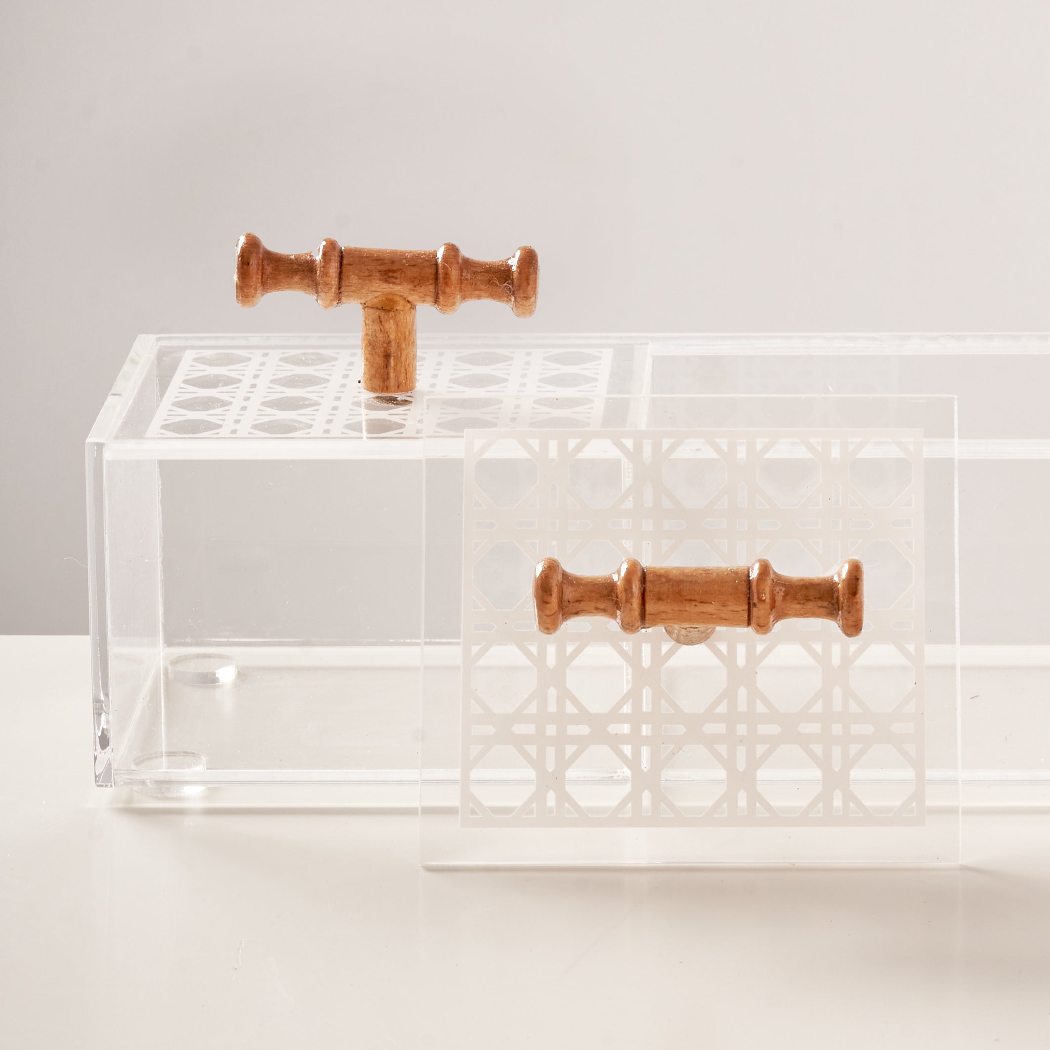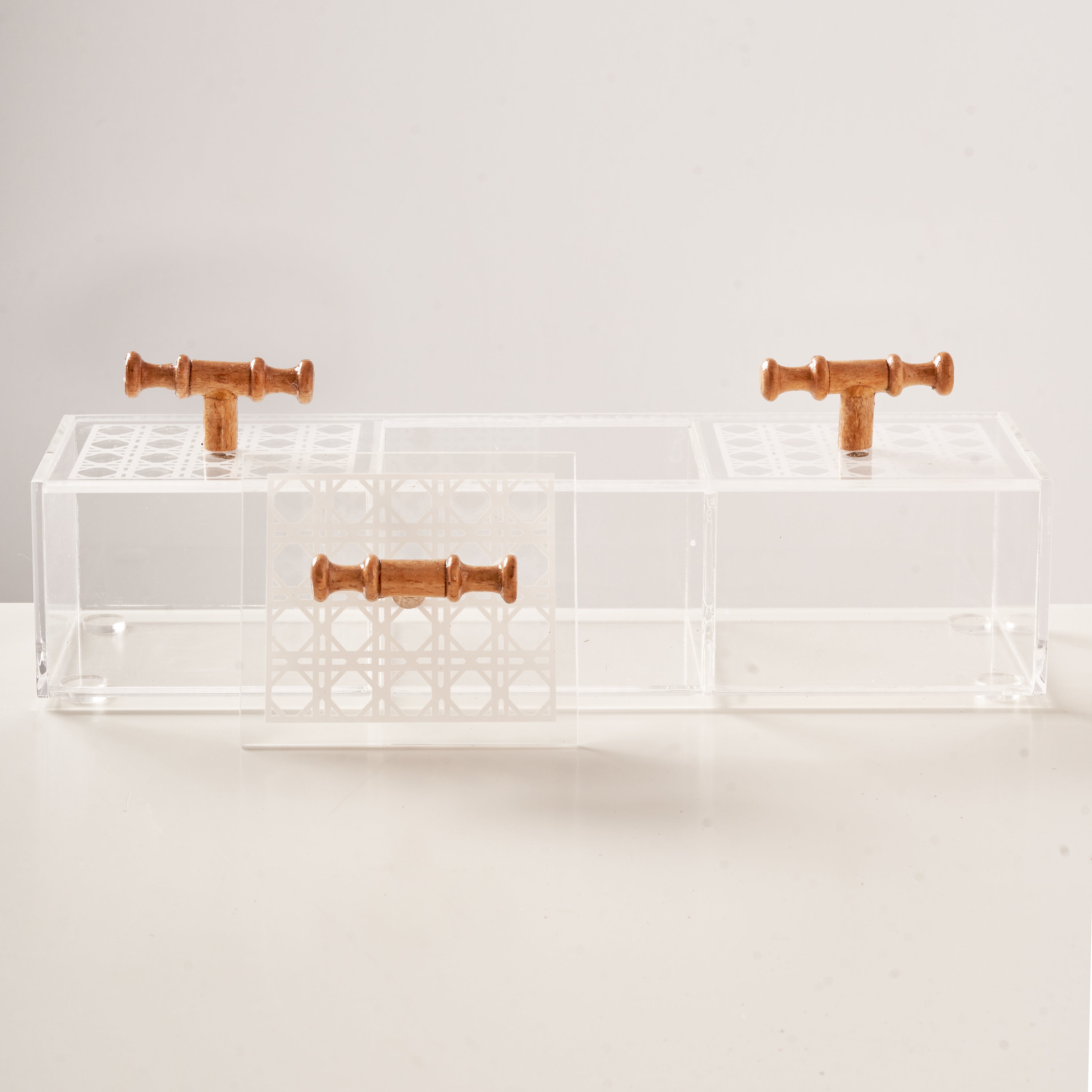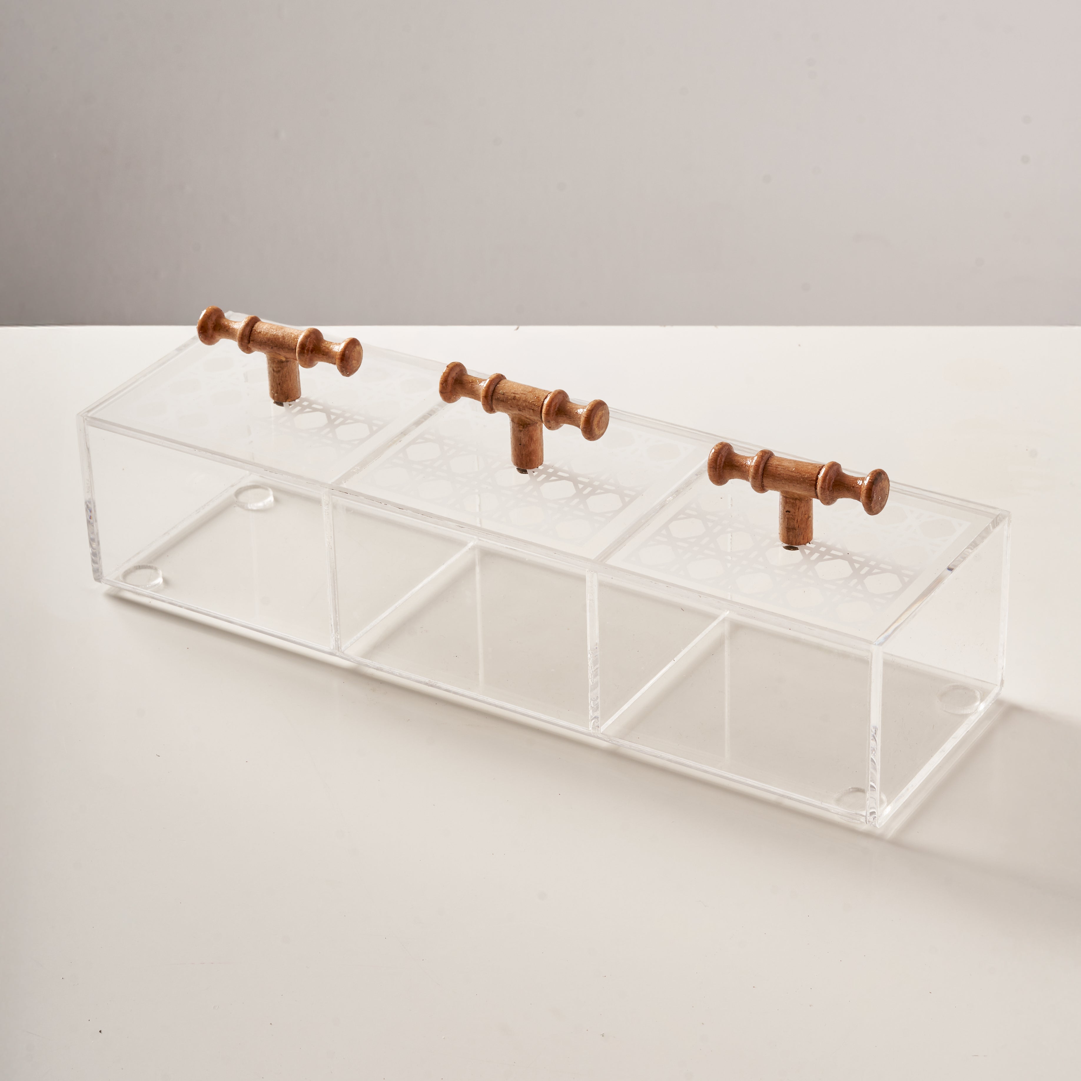 The Bambuā Treat Tray is a thoughtfully designed piece from our signature collection, blending clear acrylic, a woven cane-inspired base, and bamboo-style wooden handles for a look that’s both modern and warm. Divided into three compartments, each with its own matching lid, this tray is perfect for organizing and serving a variety of items—from treats and dried fruits to coffee capsules, sugar packets, or tea bags.