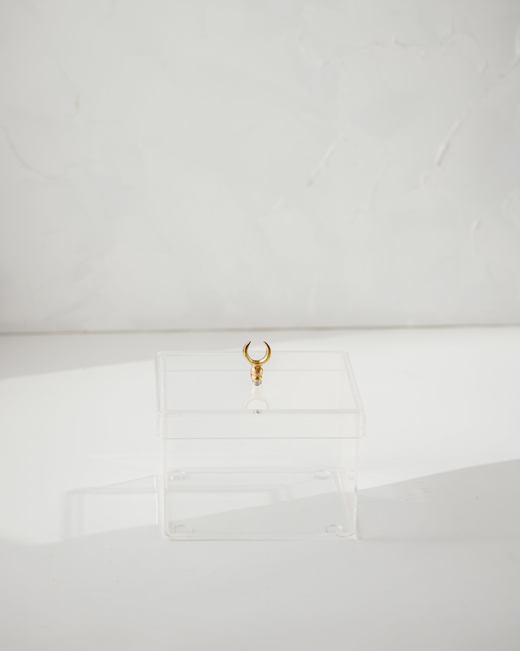 The Crescent Box blends modern elegance with a touch of luxury. Crafted from high-quality acrylic, it features a stunning gold crescent detail on the lid, adding a sophisticated and stylish touch to its sleek design. Perfect for organizing small items or as a decorative piece, this box is both functional and beautiful.