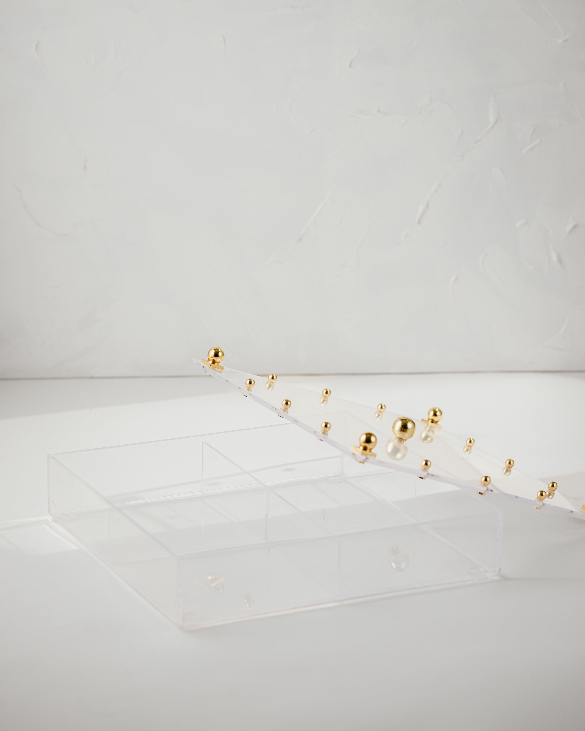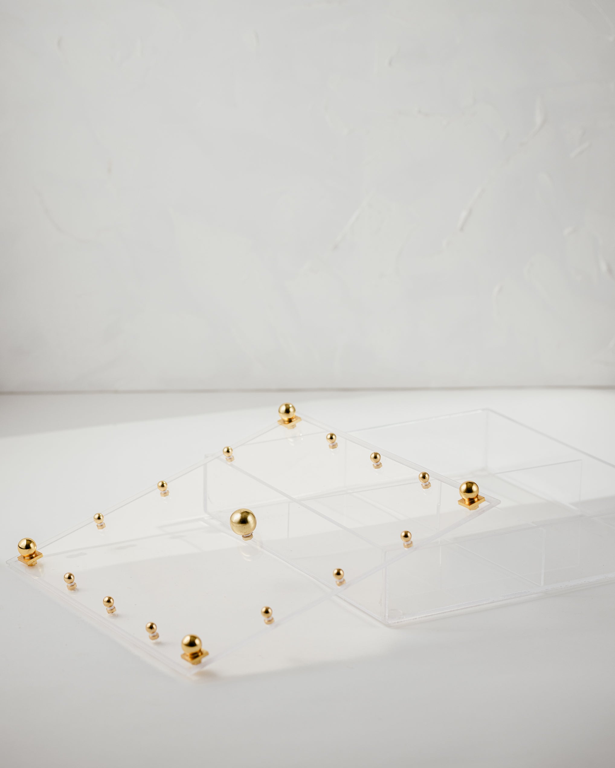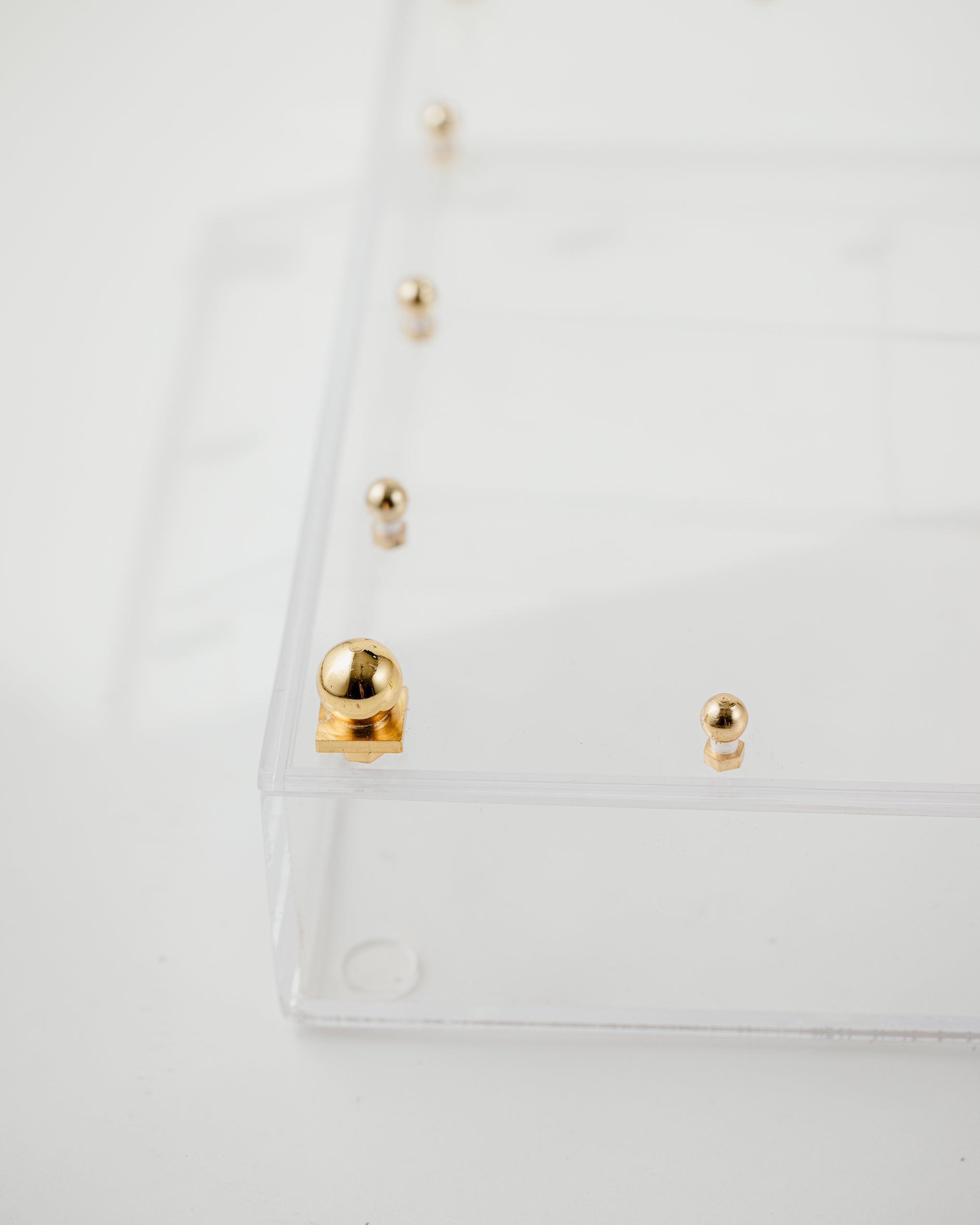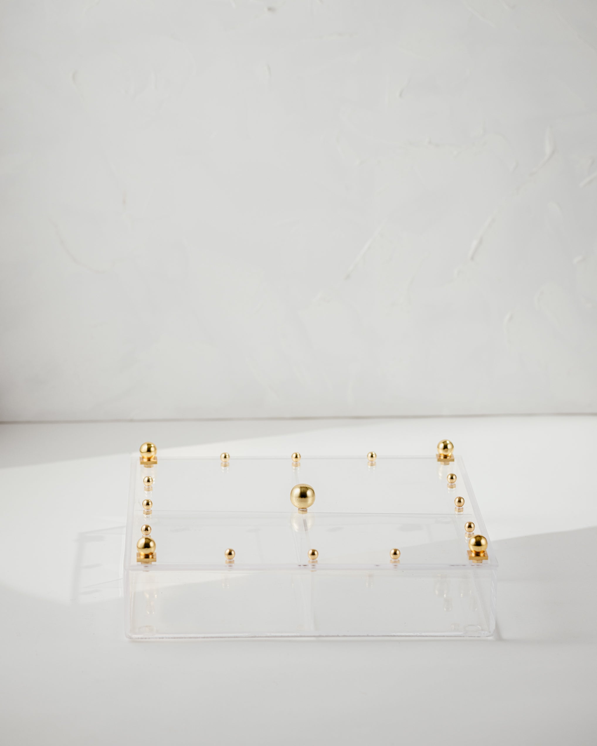 This elegant transparent acrylic piece, adorned with gold brass studs and a matching cover, perfectly balances modern simplicity with timeless sophistication. The crystal-clear acrylic showcases a sleek, minimalist aesthetic, while the warm, luxurious tones of the brass studs add a touch of opulence. Designed for both functionality and style, this piece effortlessly elevates any setting with its refined yet contemporary charm.