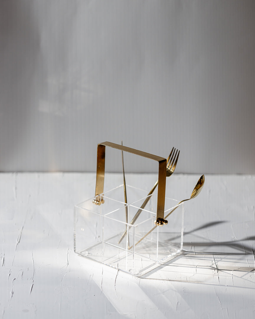 Bring effortless elegance to your table with this cutlery holder, featuring a clear acrylic design with a gold-plated brass holder, combining modern minimalism with a touch of luxury. Its sleek, elegant look makes it ideal for both everyday use and special occasions, offering a stylish and organized way to store cutlery.