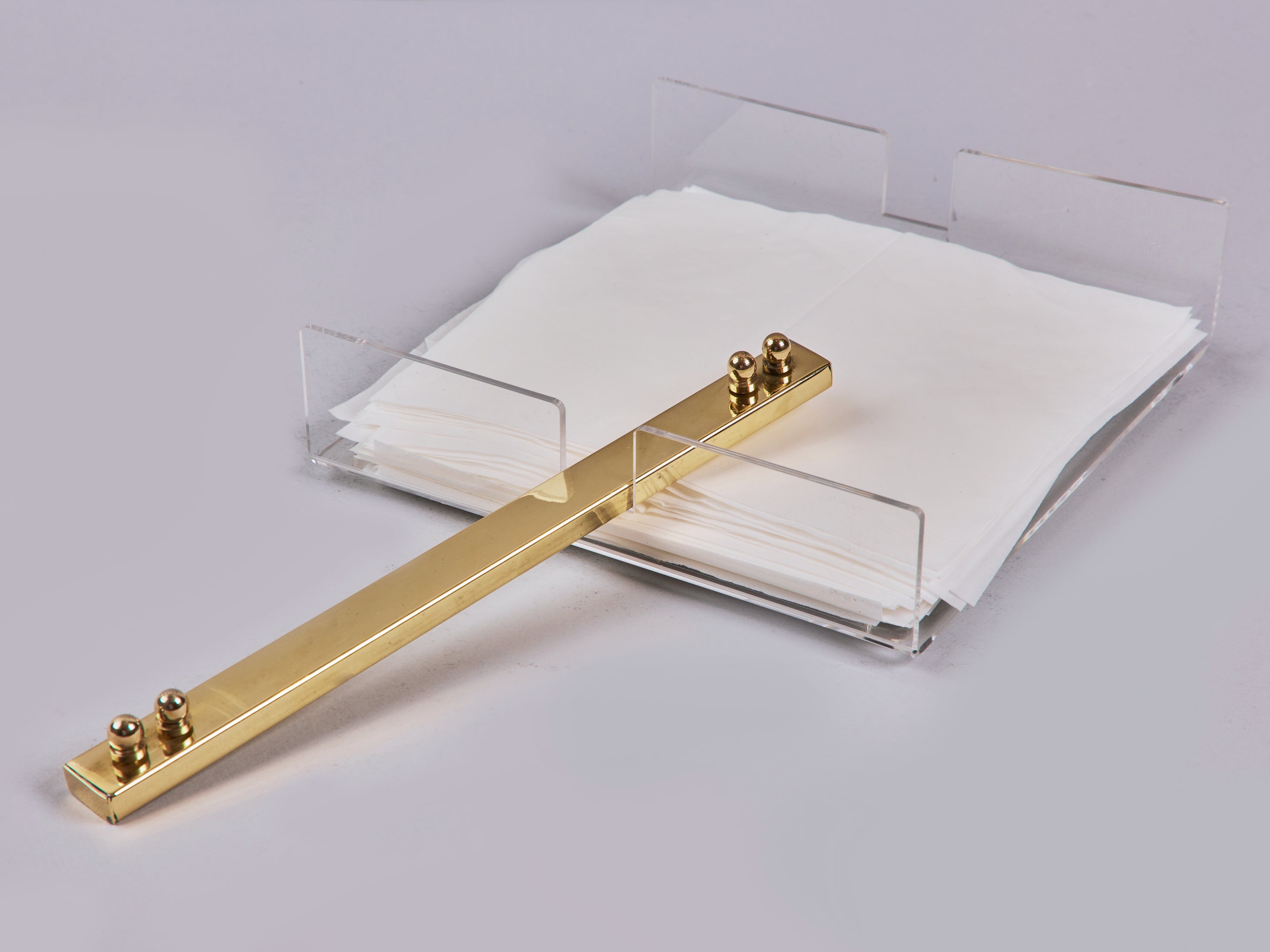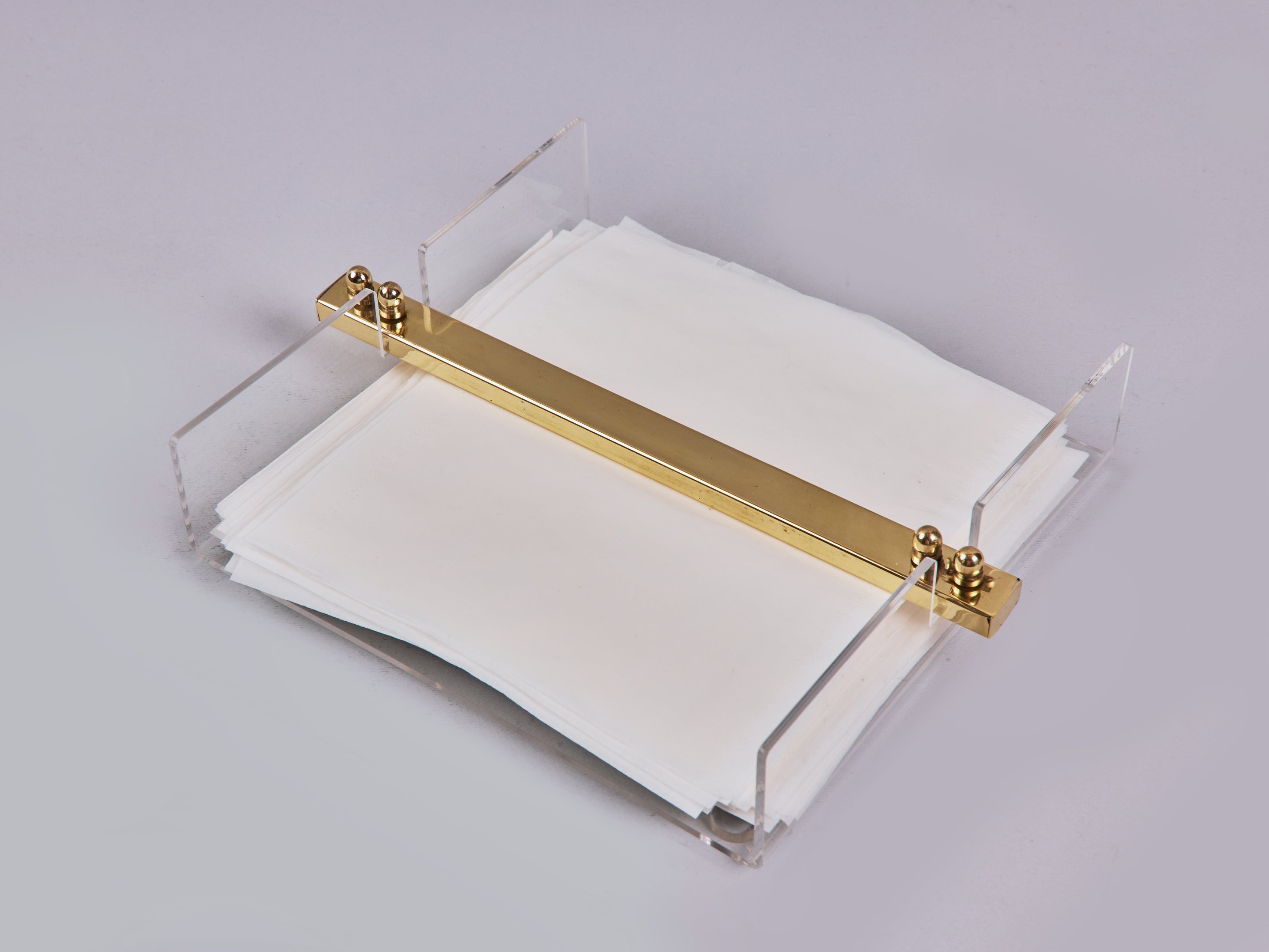 Bring effortless elegance to your table with this acrylic napkin box. It combines modern design with a touch of luxury. The clear acrylic body offers a minimalist look, while the gold-plated brass holder adds sophistication. Ideal for everyday use or special occasions, it provides an elegant and organized way to store napkins.