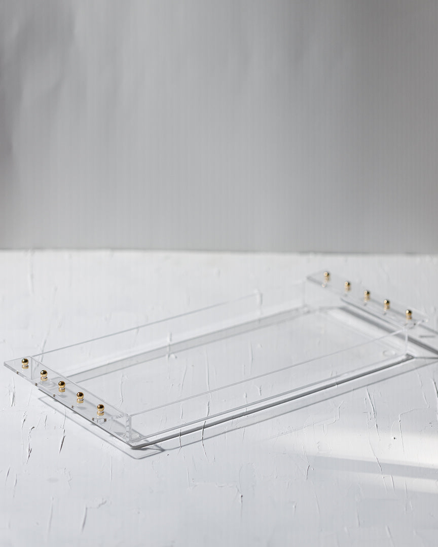 This elegant transparent acrylic piece, adorned with gold brass studs and a matching cover, perfectly balances modern simplicity with timeless sophistication. The crystal-clear acrylic showcases a sleek, minimalist aesthetic, while the warm, luxurious tones of the brass studs add a touch of opulence. Designed for both functionality and style, this piece effortlessly elevates any setting with its refined yet contemporary charm.