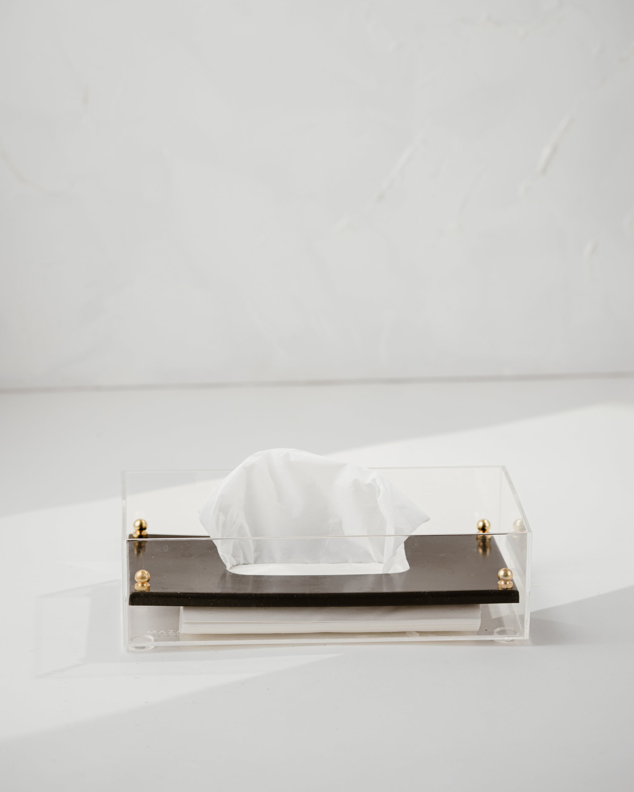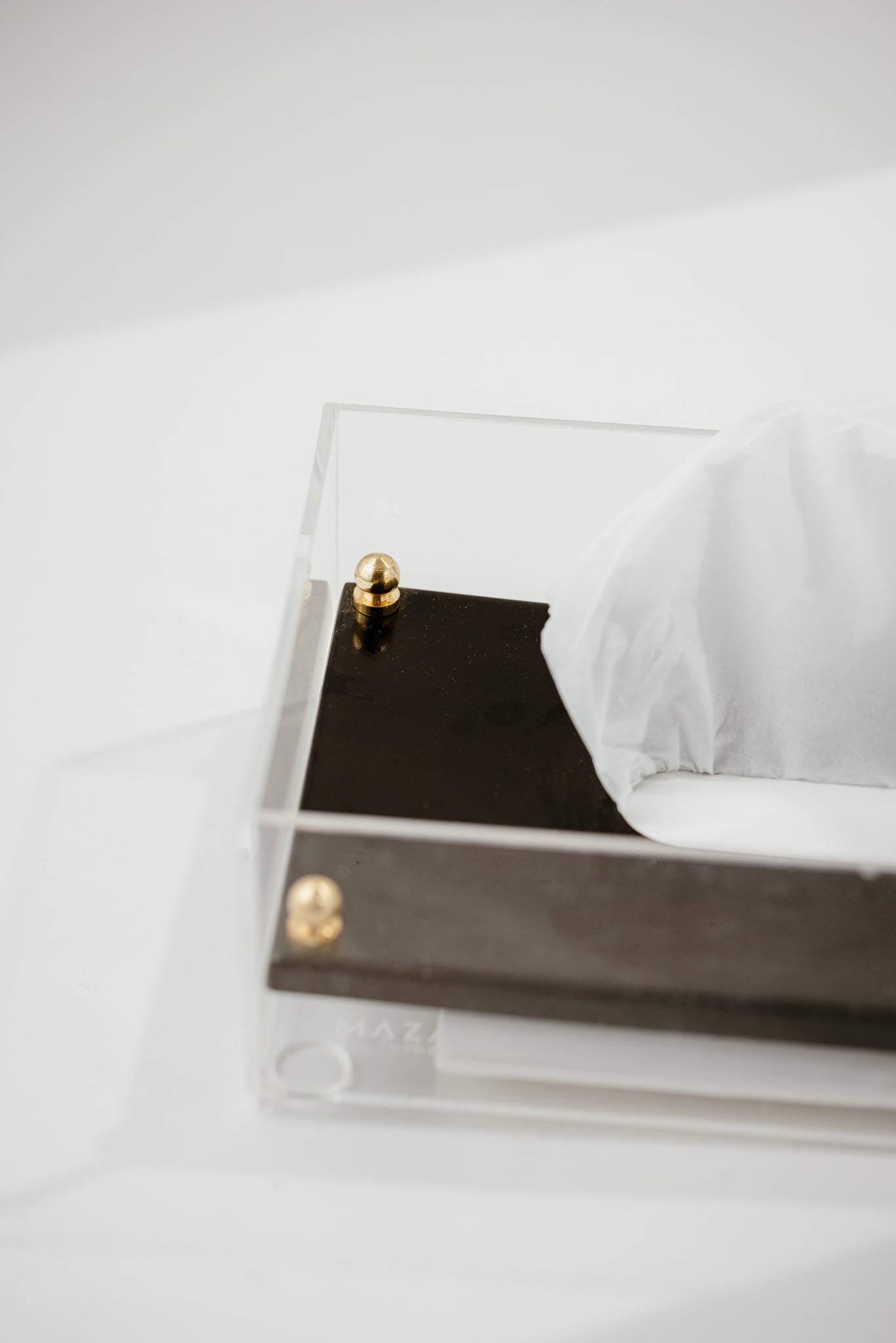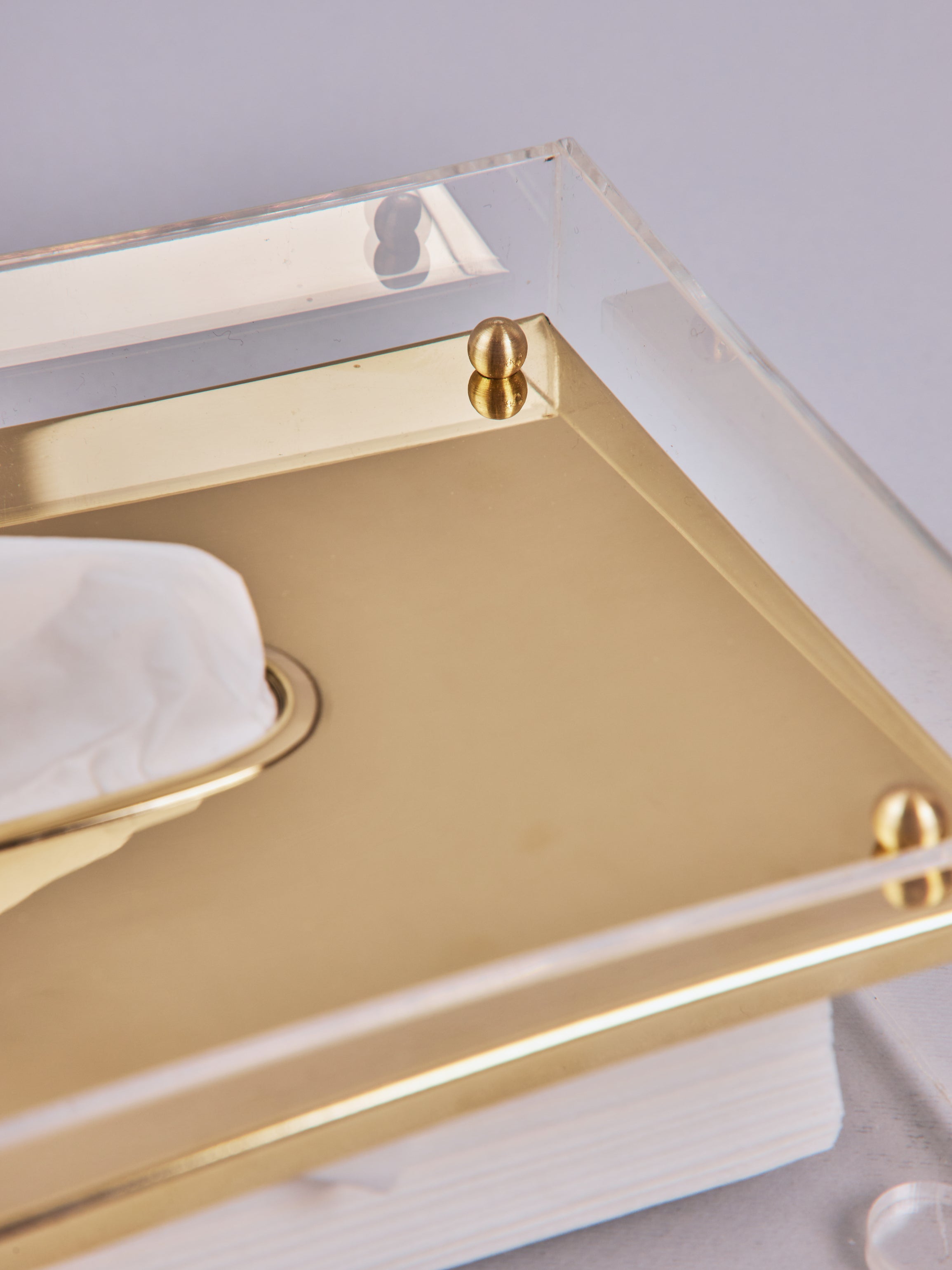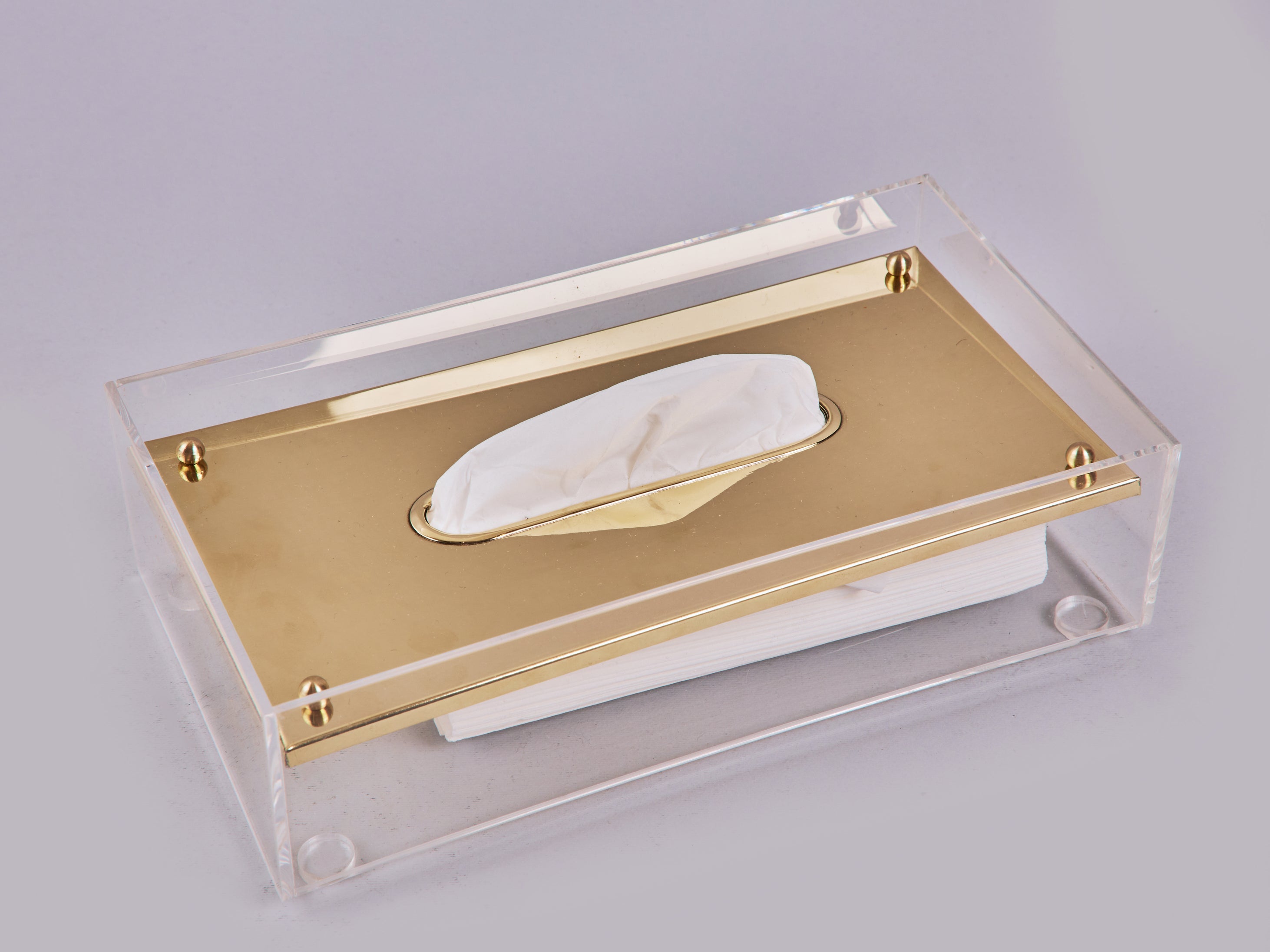 This sleek acrylic tissue box combines modern minimalism with timeless elegance. Its crystal-clear body is paired with a gold-plated stainless lid, bringing a touch of luxury to any space. Ideal for both practical use and decorative charm, it complements contemporary interiors seamlessly.