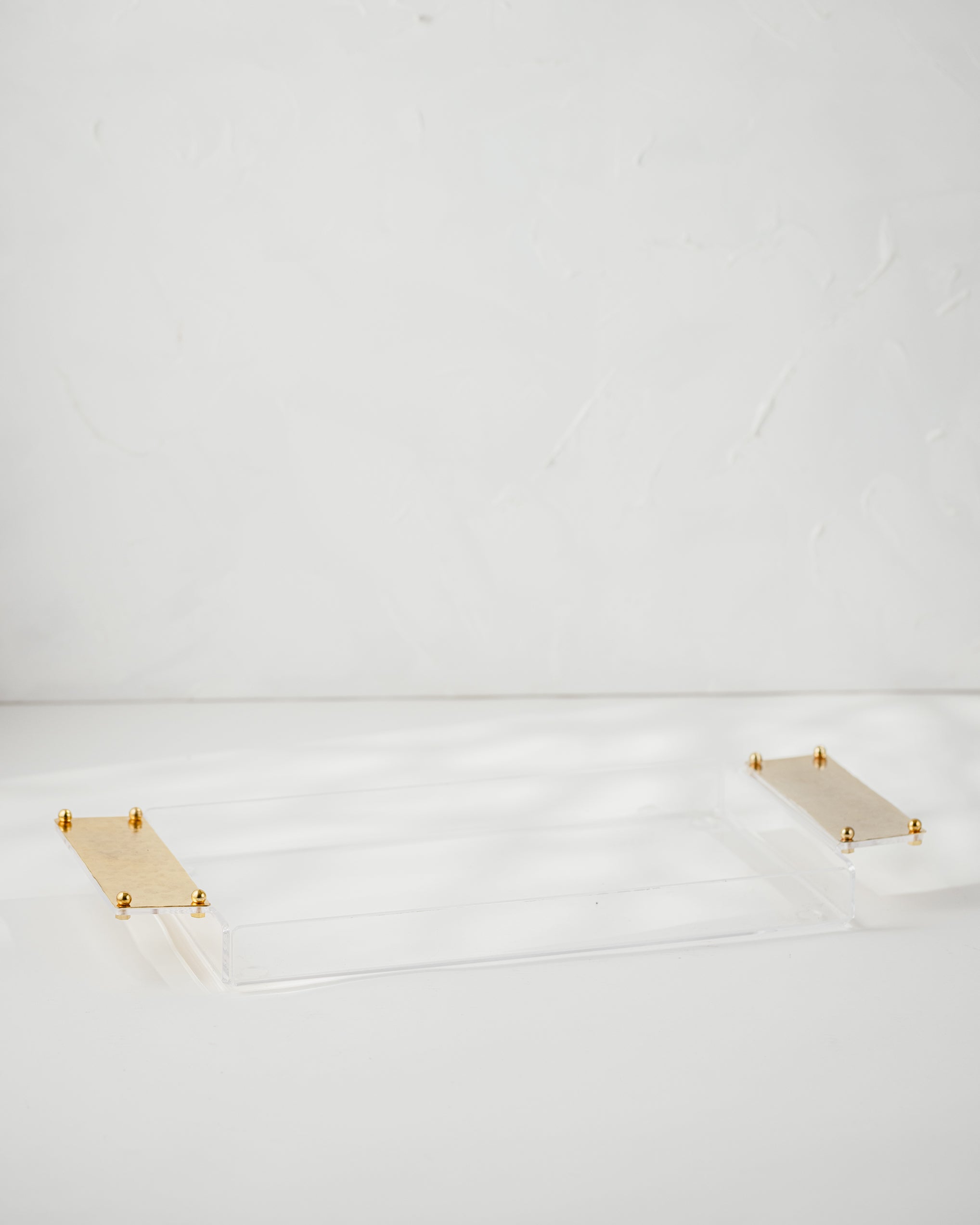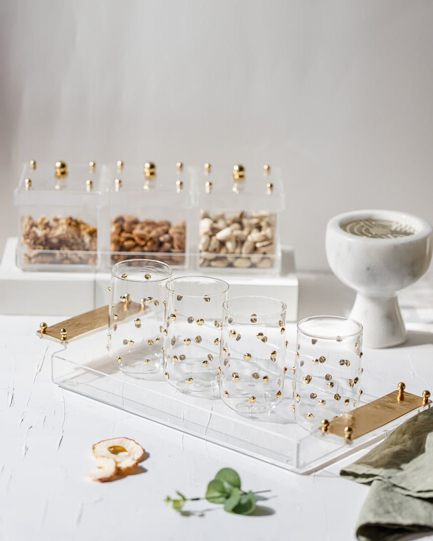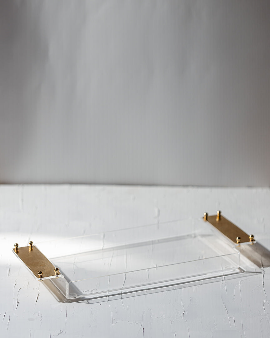 Elevate your hosting experience with the Golden Grace Acrylic Tray. Crafted from high-quality acrylic, this sleek and modern tray is accented with stunning gold-plated hammered brass handles, offering a perfect balance of contemporary design and timeless elegance. The handles’ unique texture adds a touch of sophistication, while the transparent acrylic base allows your tabletop décor to shine through.