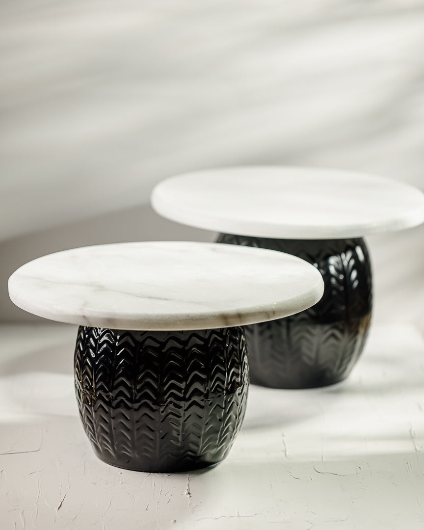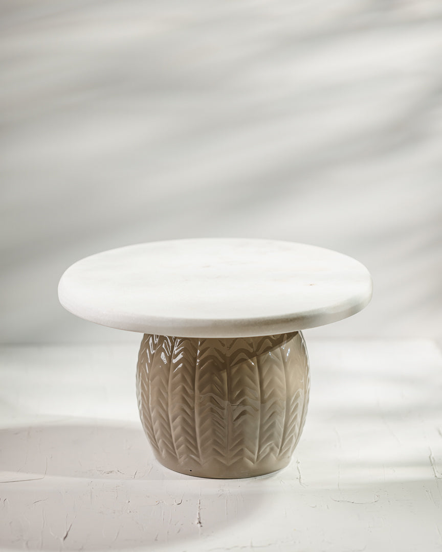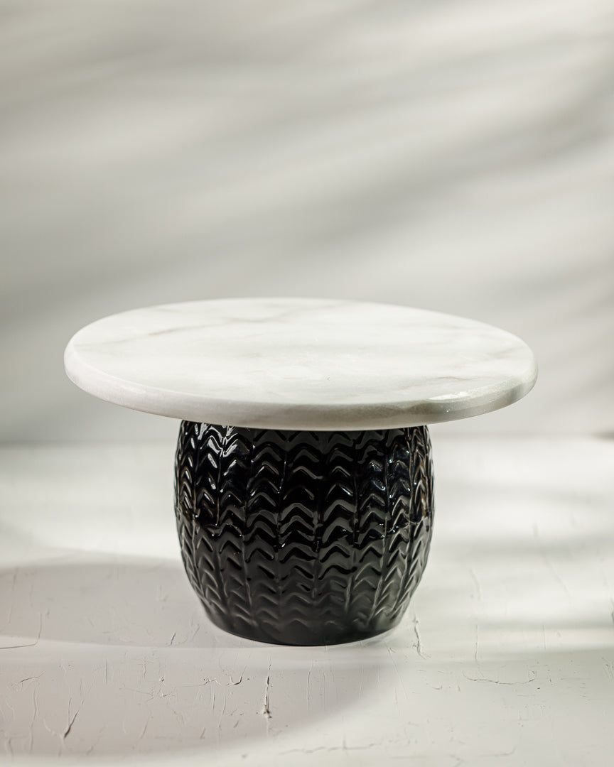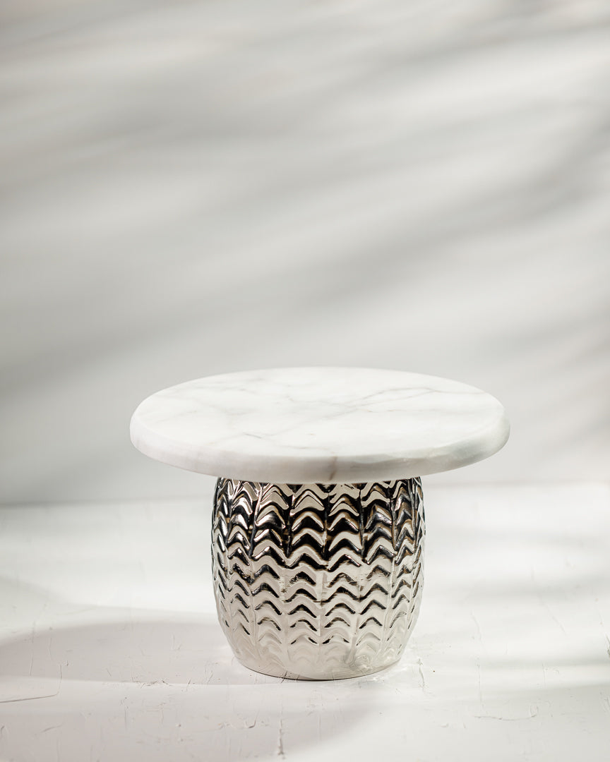 A stunning blend of modern design and timeless elegance. Featuring a sleek metal base with a bold chevron pattern and a luxurious marble top, this versatile piece can be used as both a serving platter or a striking decor accent. Available in two sizes and four elegant colors, the Chevron Marble Stand complements any setting, adding sophistication to your tabletop or display. Whether you're serving food or showcasing decorative items, this piece brings style and functionality to your space.