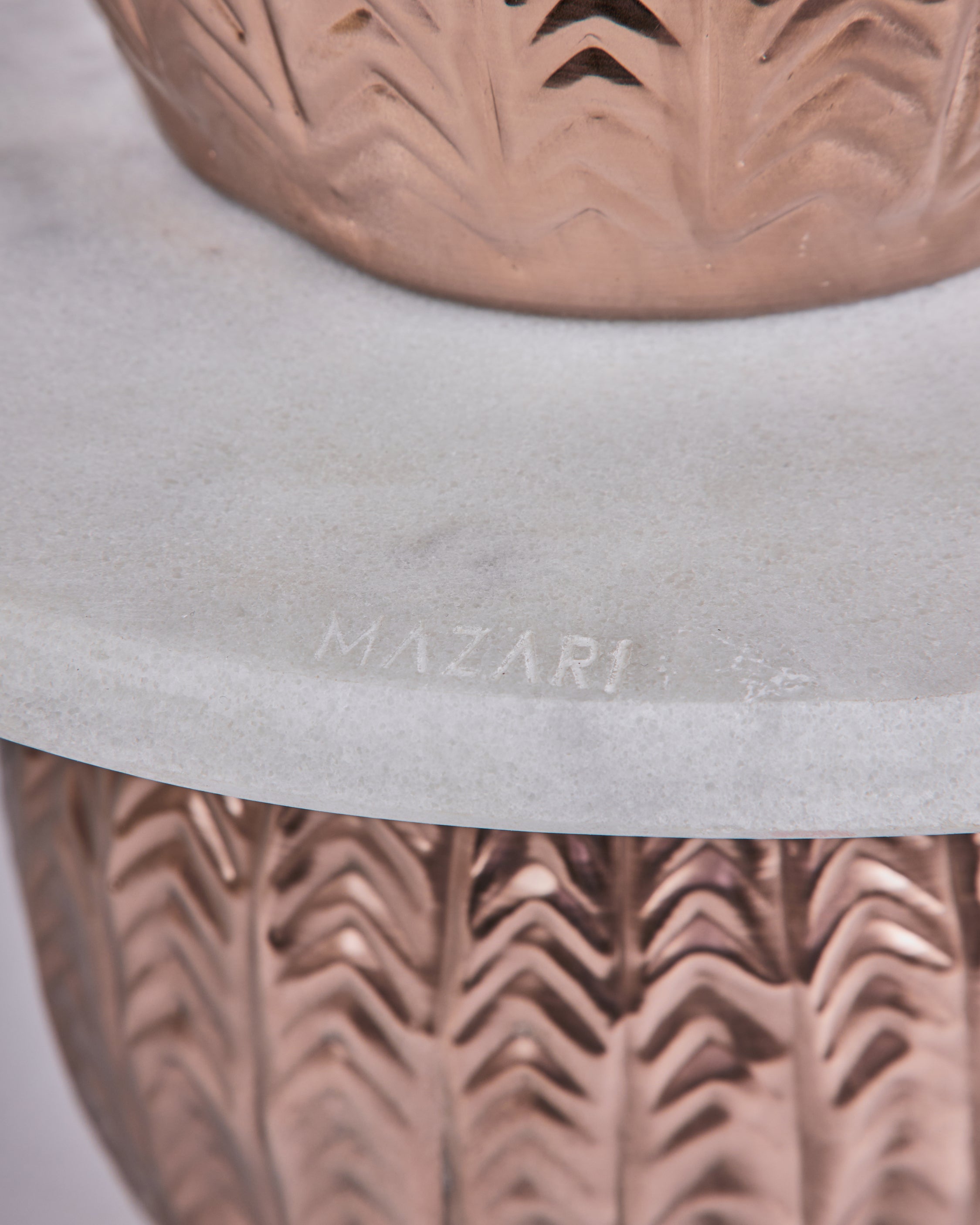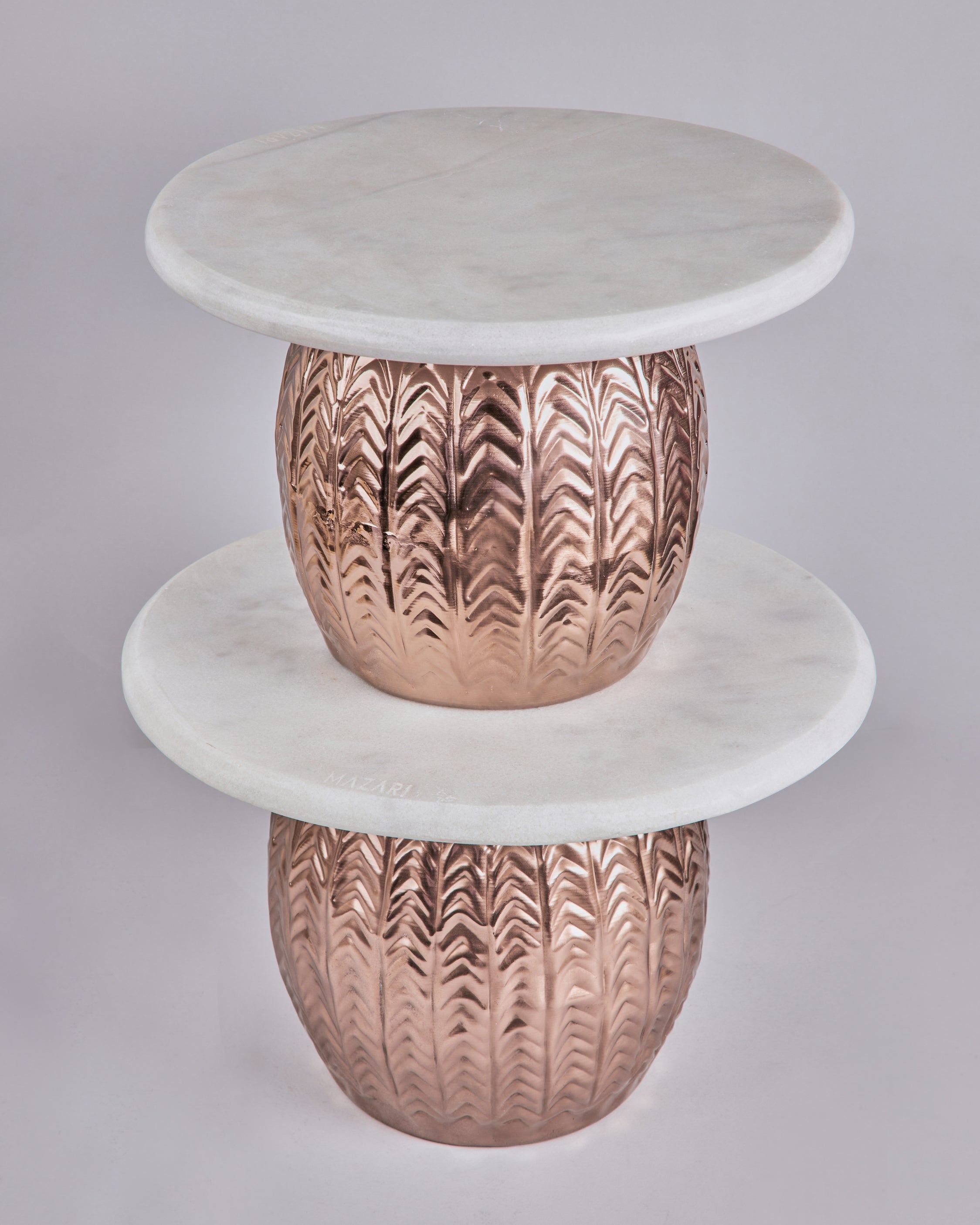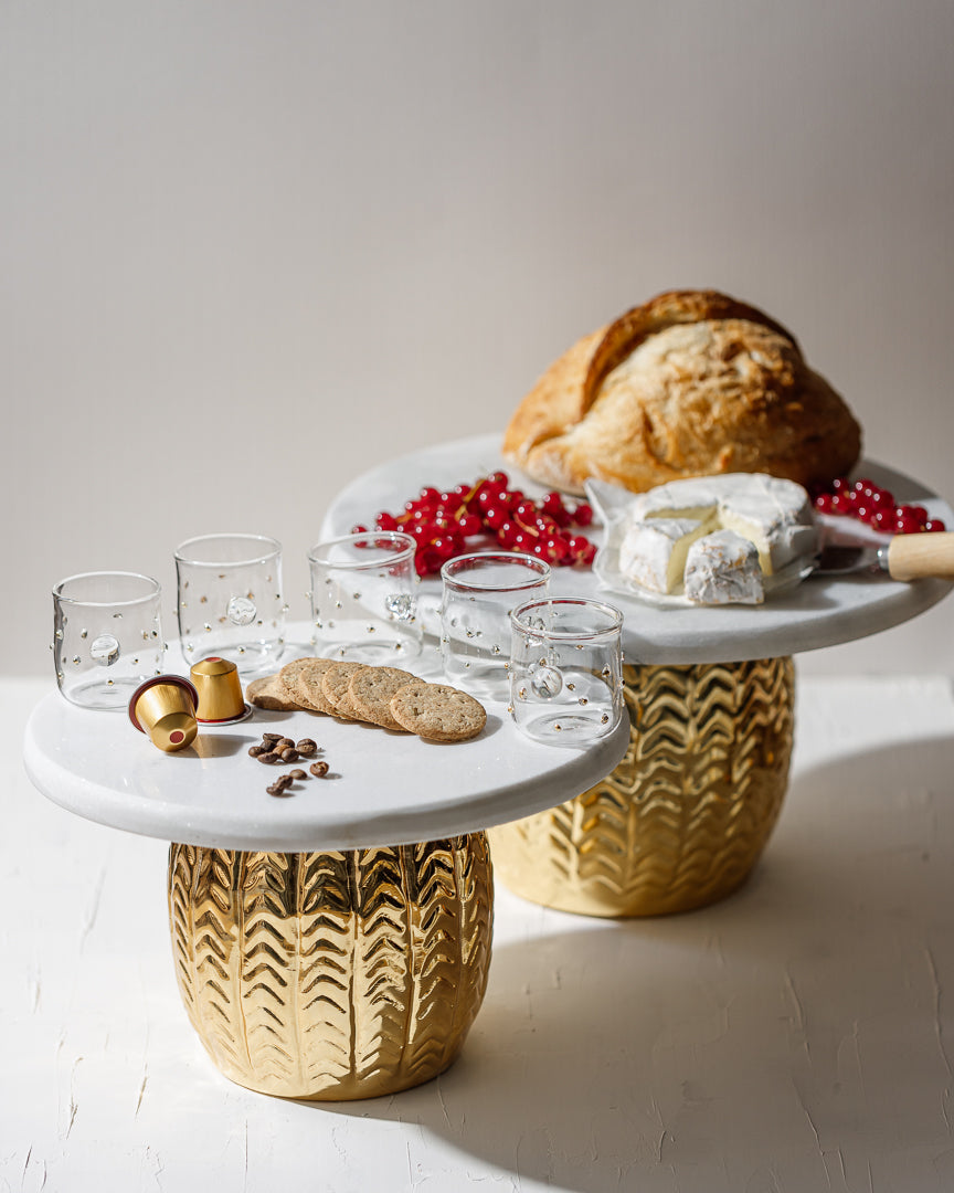 A stunning blend of modern design and timeless elegance. Featuring a sleek metal base with a bold chevron pattern and a luxurious marble top, this versatile piece can be used as both a serving platter or a striking decor accent. Available in two sizes and four elegant colors, the Chevron Marble Stand complements any setting, adding sophistication to your tabletop or display. Whether you're serving food or showcasing decorative items, this piece brings style and functionality to your space.