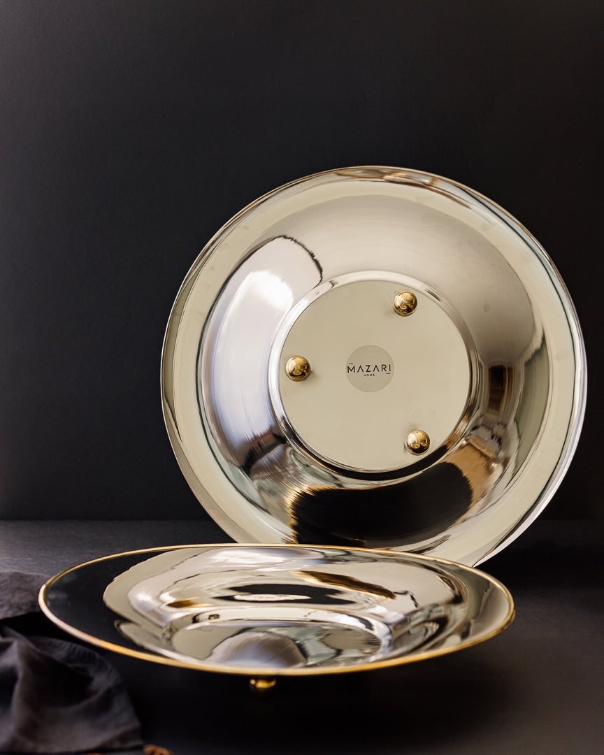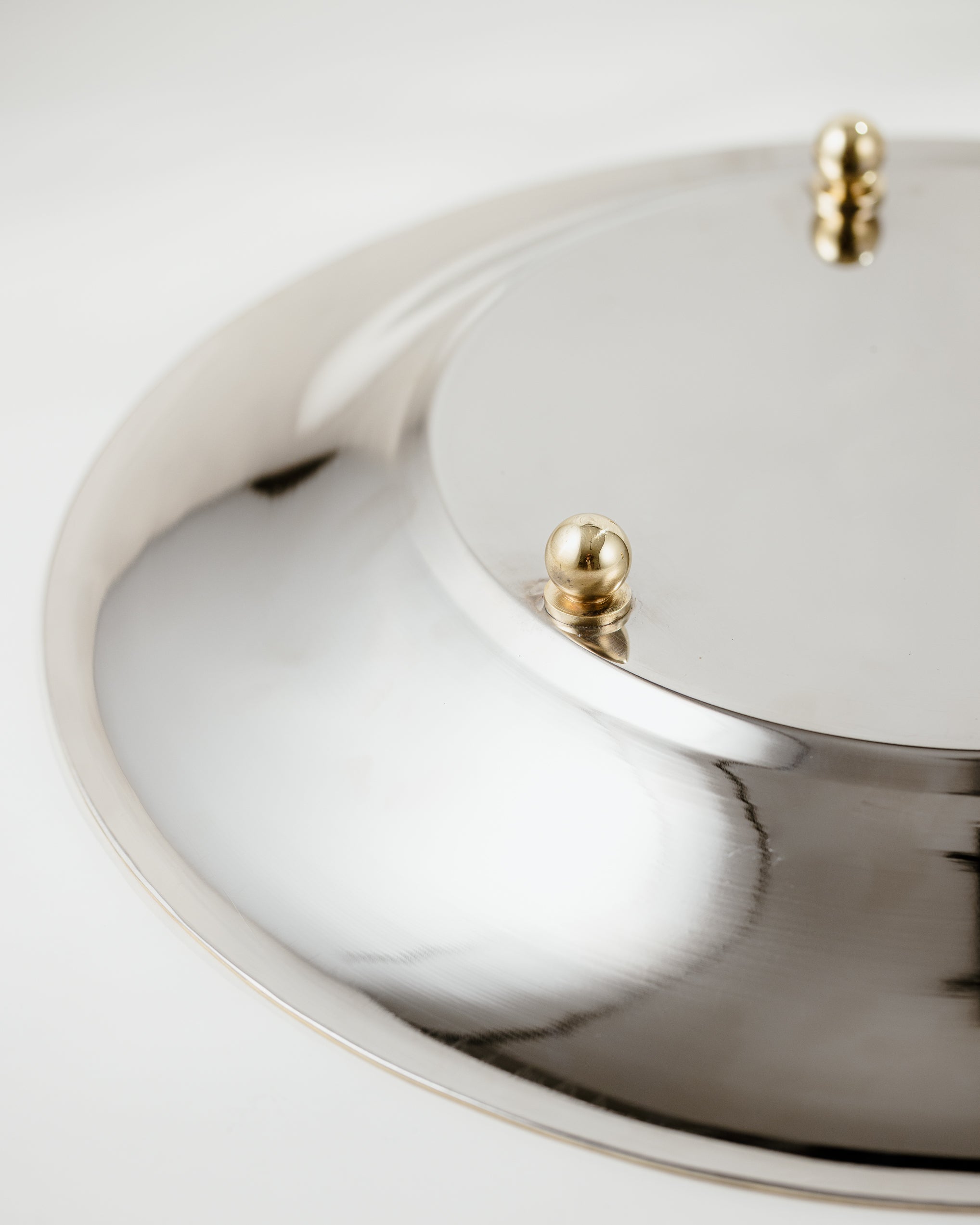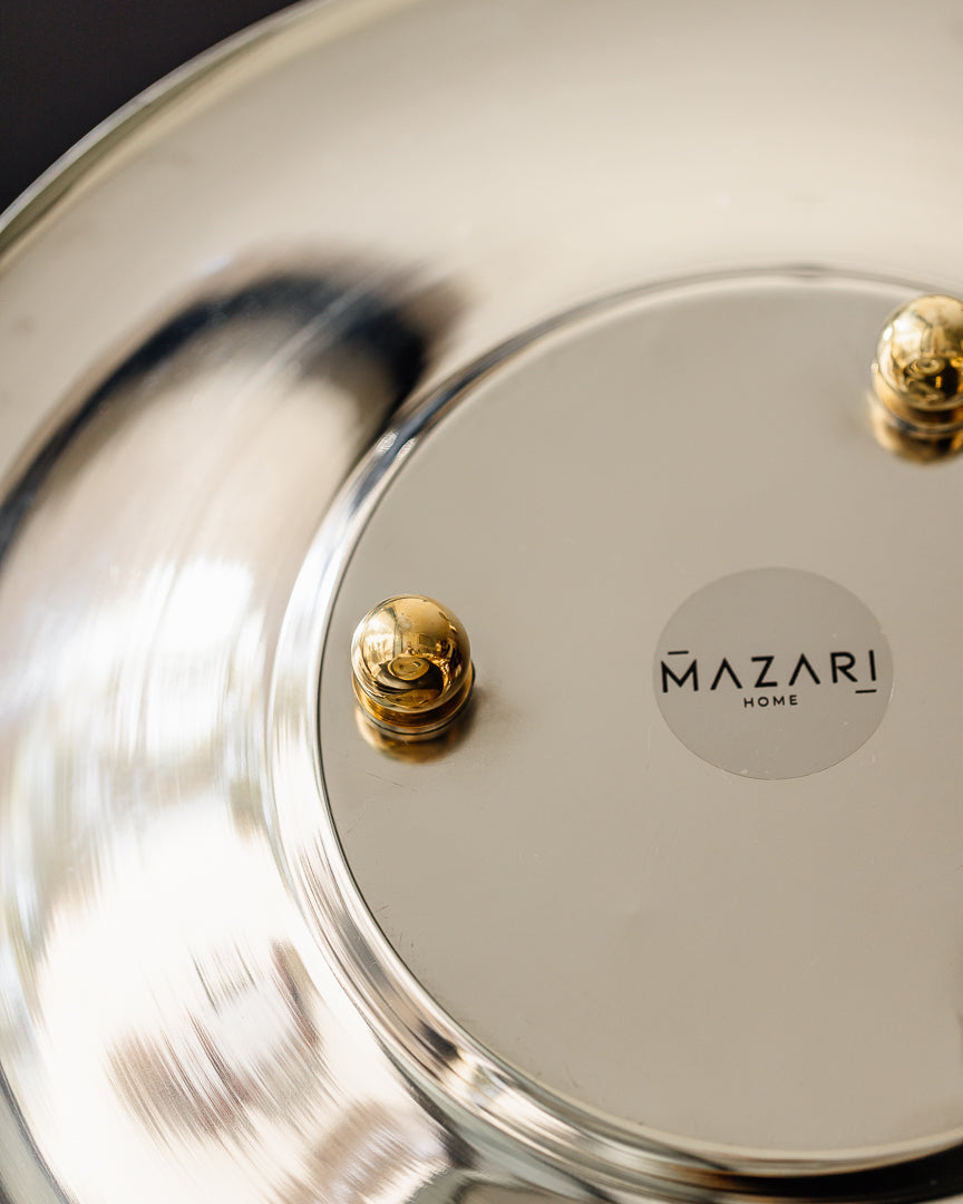 This stunning Stainless Steel Piece features gold brass ornaments, blending modern sophistication with classic luxury. The smooth, reflective surface of the stainless steel contrasts beautifully with the warm, rich tones of the brass details, creating a piece that is as functional as it is visually striking.