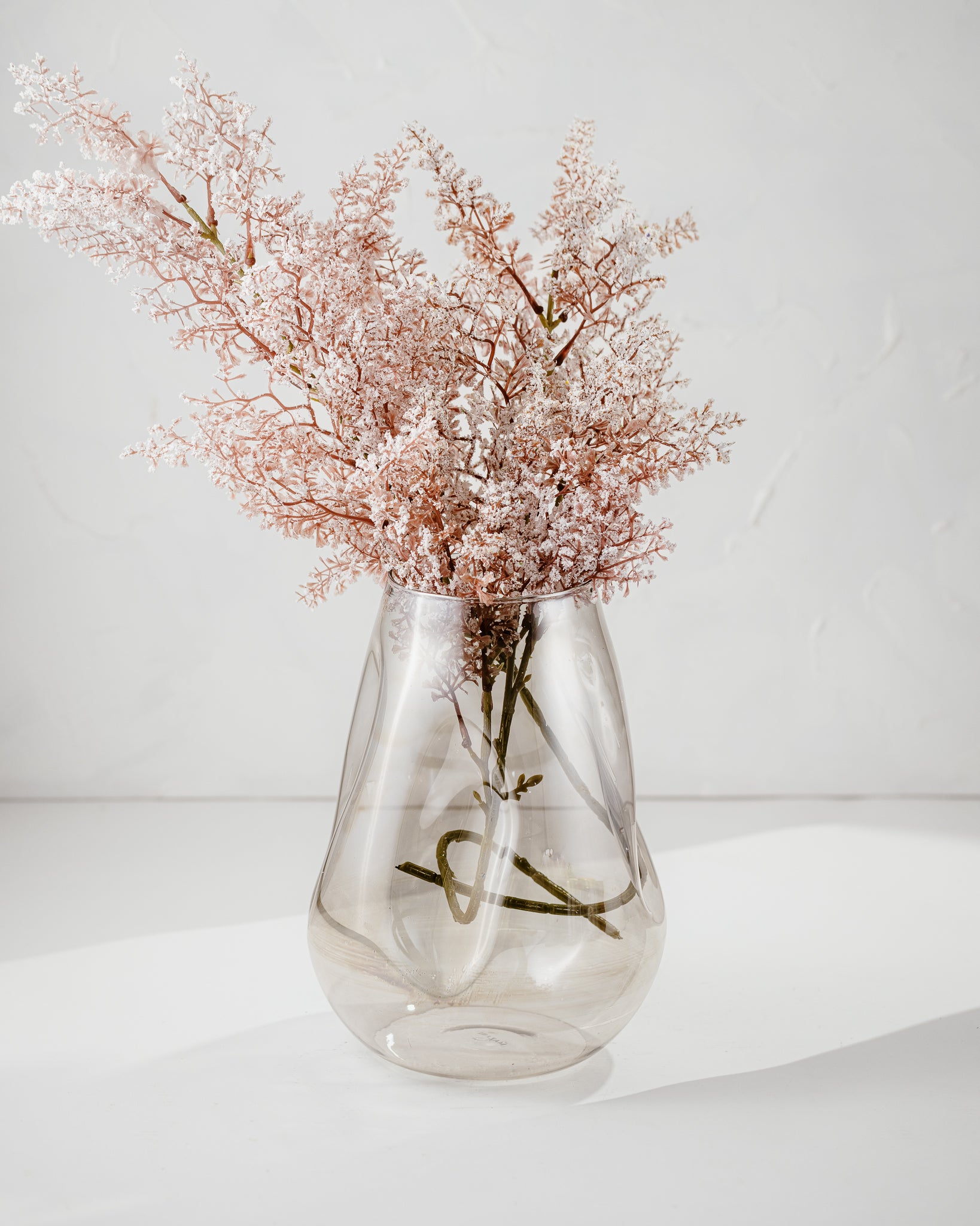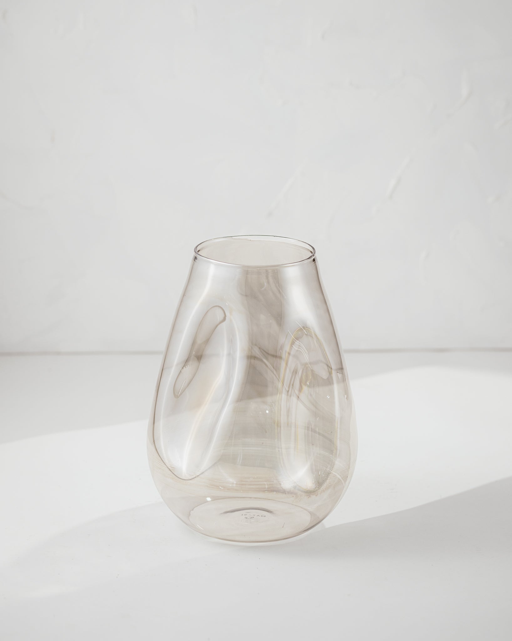 This vase features a sleek grey glass with a wavy, irregular design that adds an organic, artistic touch to its modern form. Its fluid shape and smooth finish make it a striking centerpiece, perfect for showcasing flowers or as an accent piece. The unique, undulating contours bring a sense of movement and sophistication to any space.