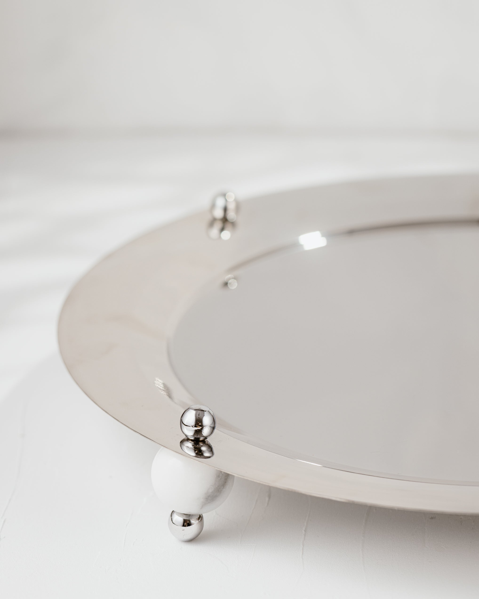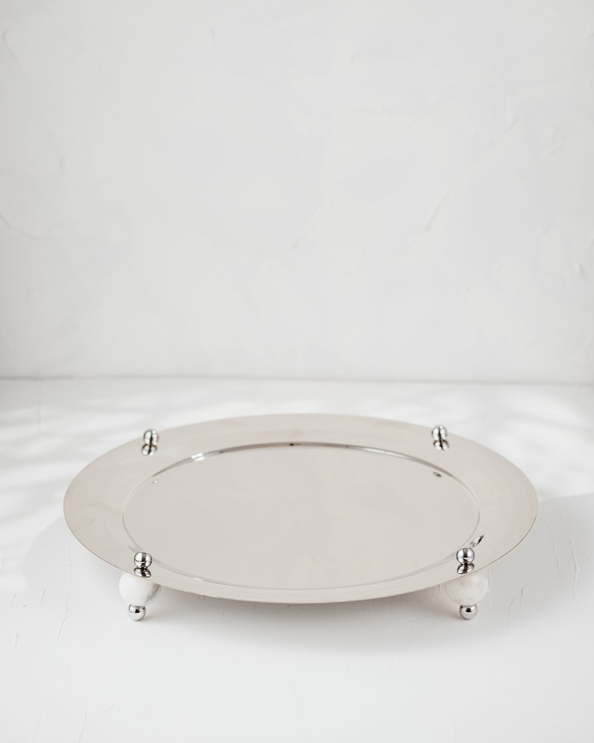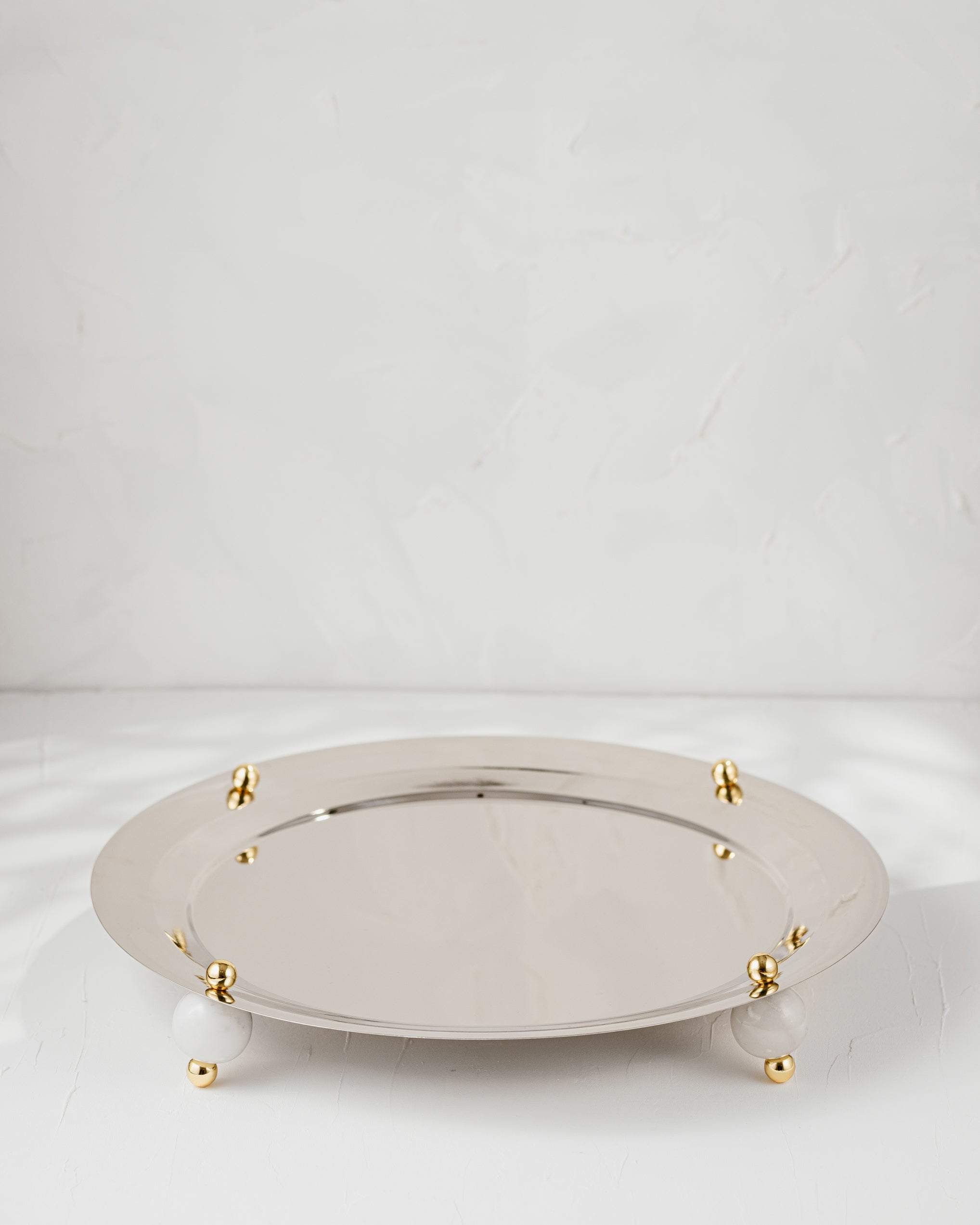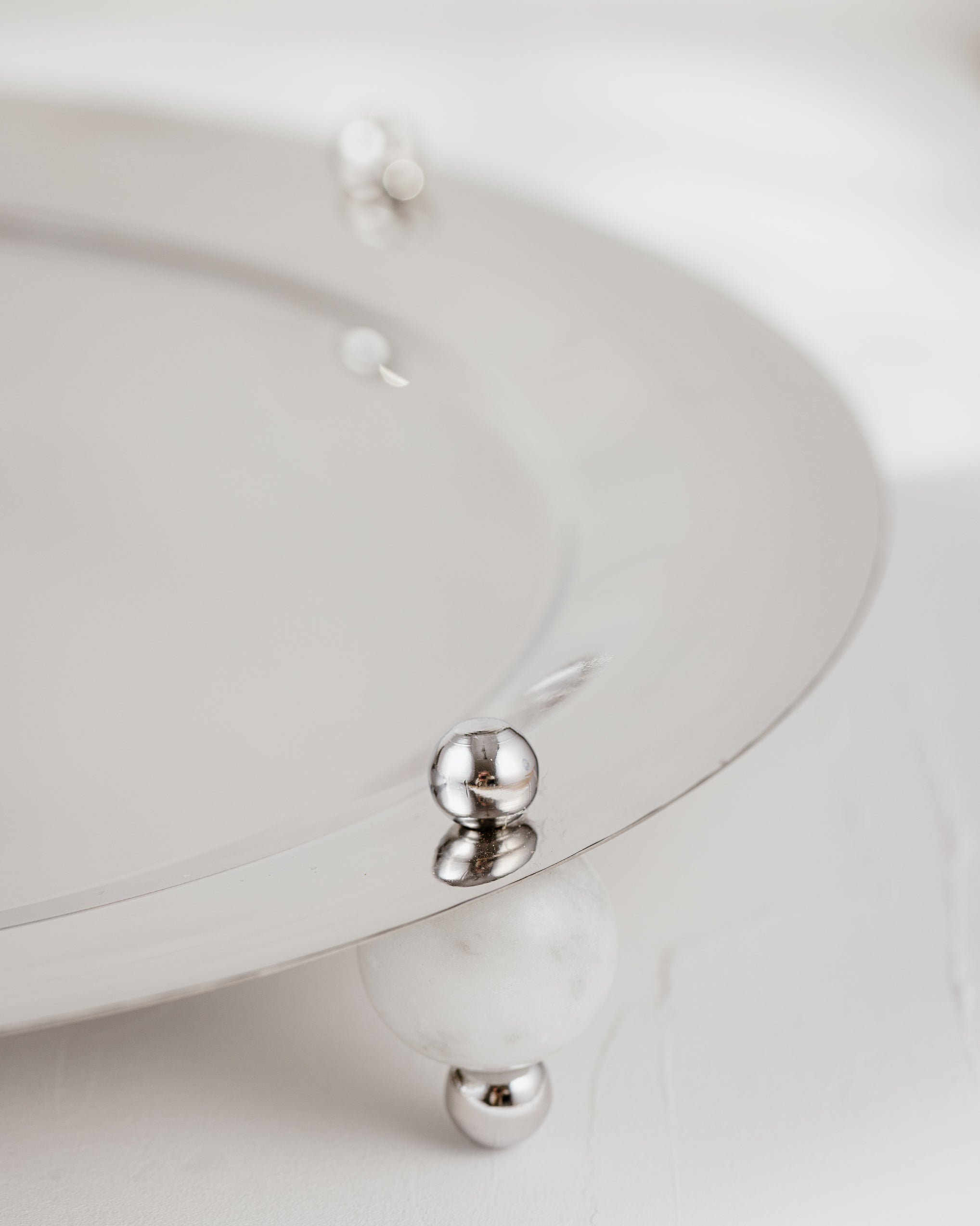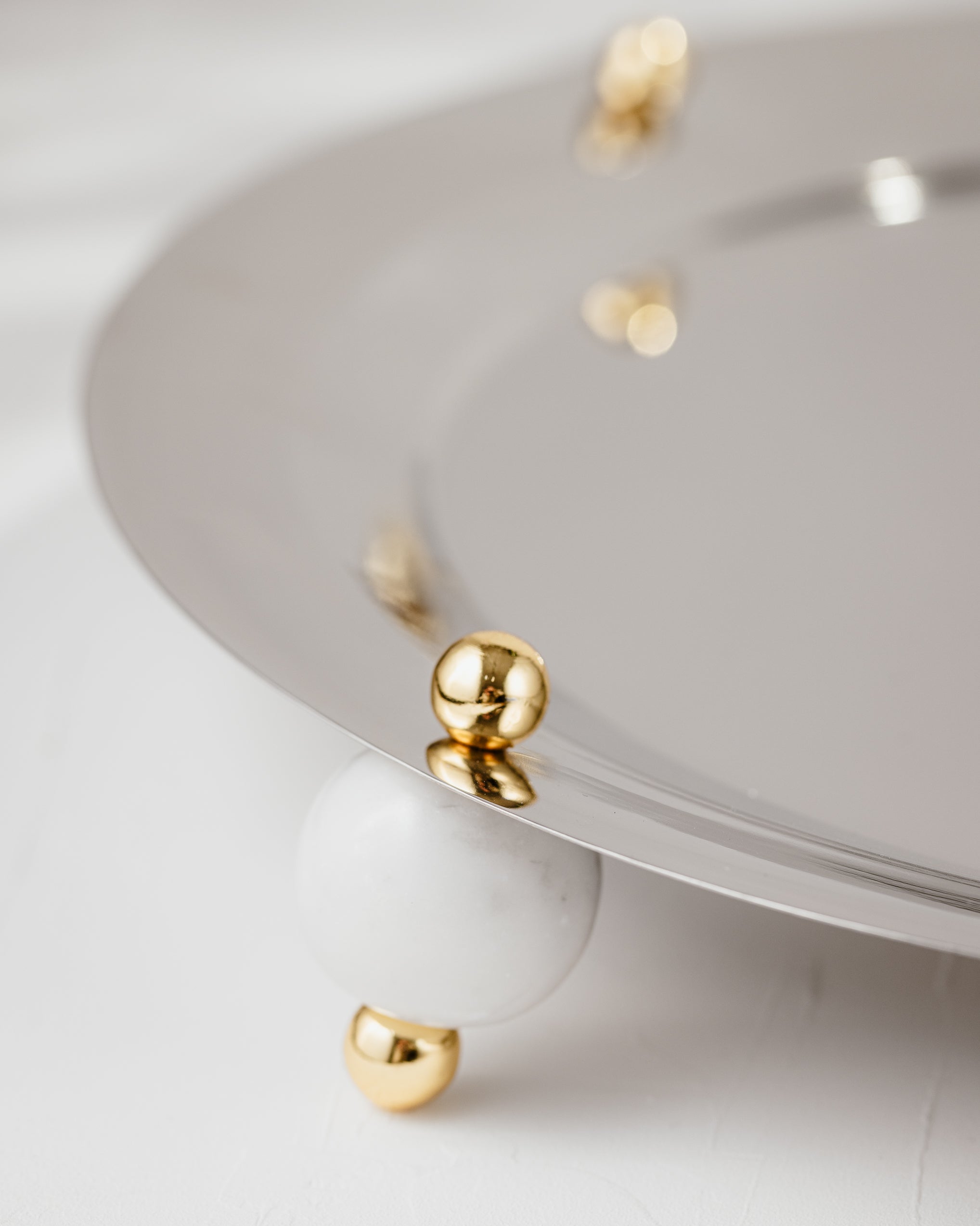 The Silverstone Round harmoniously combines the sleek elegance of stainless steel with the timeless charm of marble and brass. Its perfectly balanced circular design offers a sophisticated platform for serving appetizers, salads, entrées, or desserts. Elevated by marble and brass risers, this piece adds subtle height and striking visual appeal to any table setting. Available in both silver-plated and gold-plated finishes, the Silverstone Round is a true reflection of luxury and craftsmanship — transforming every dining experience into an artful celebration.