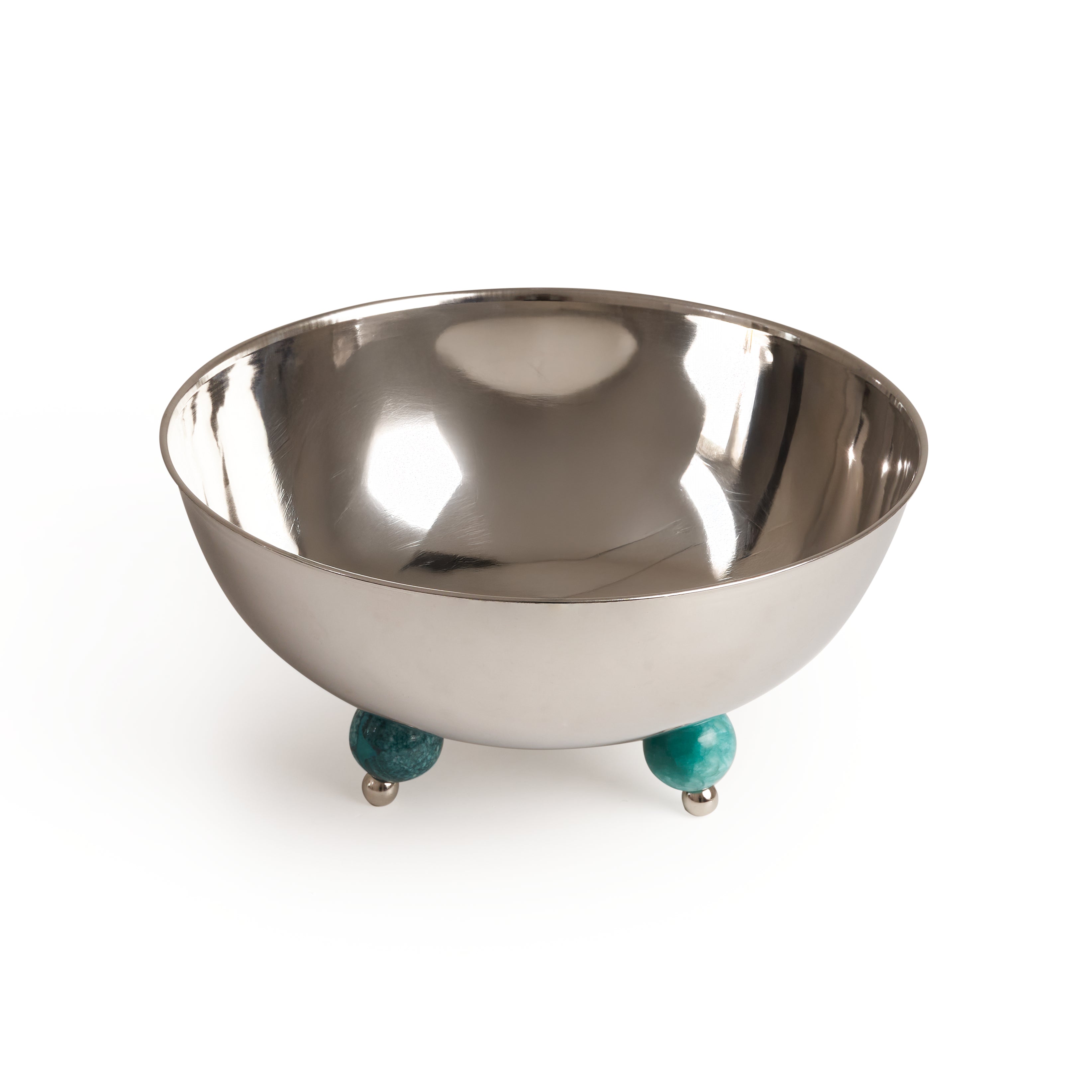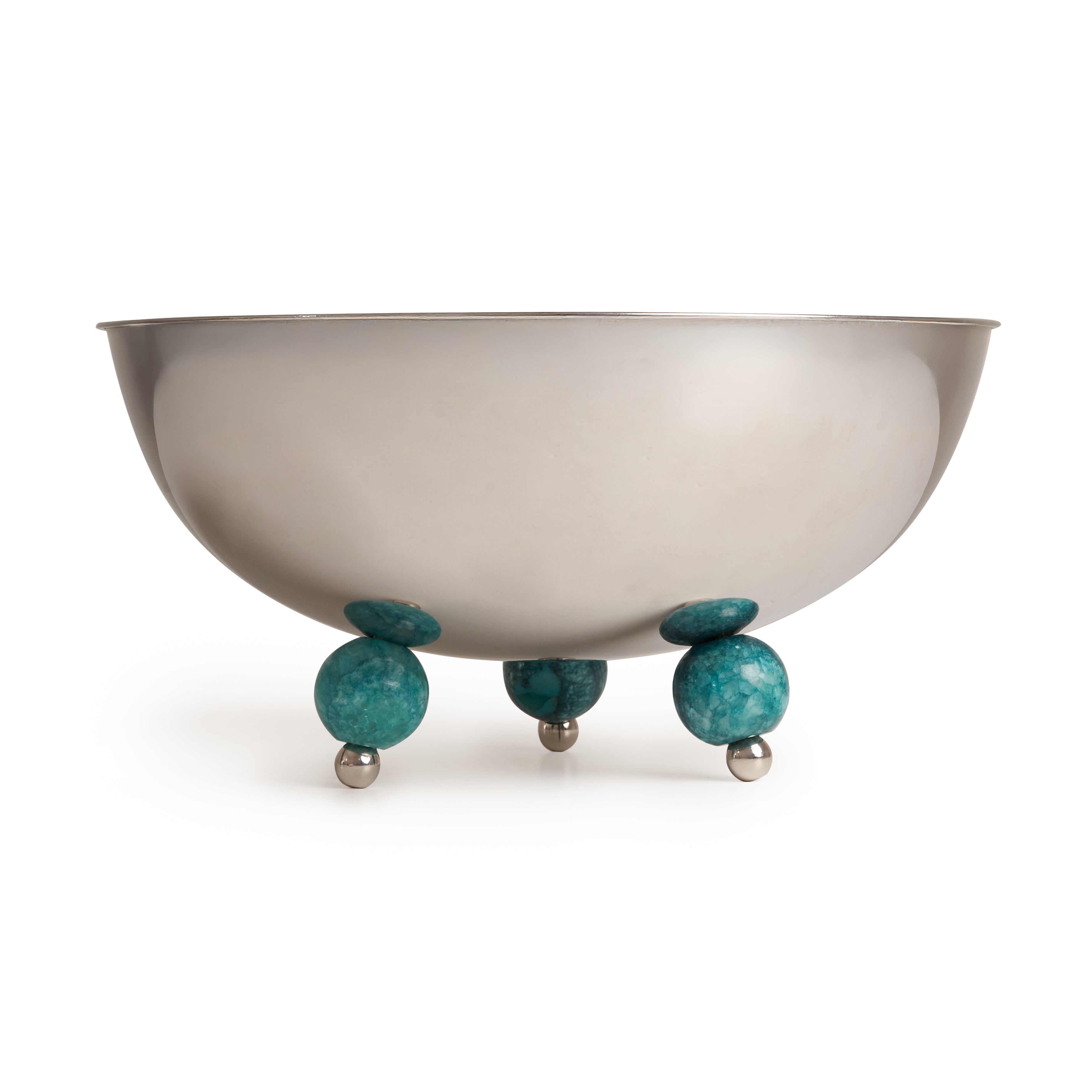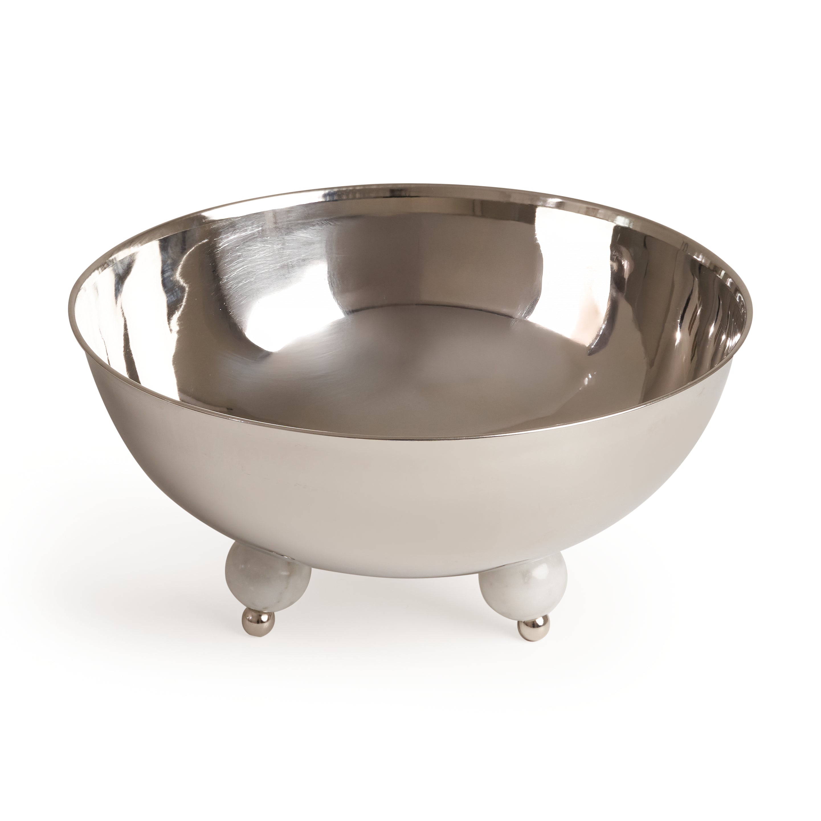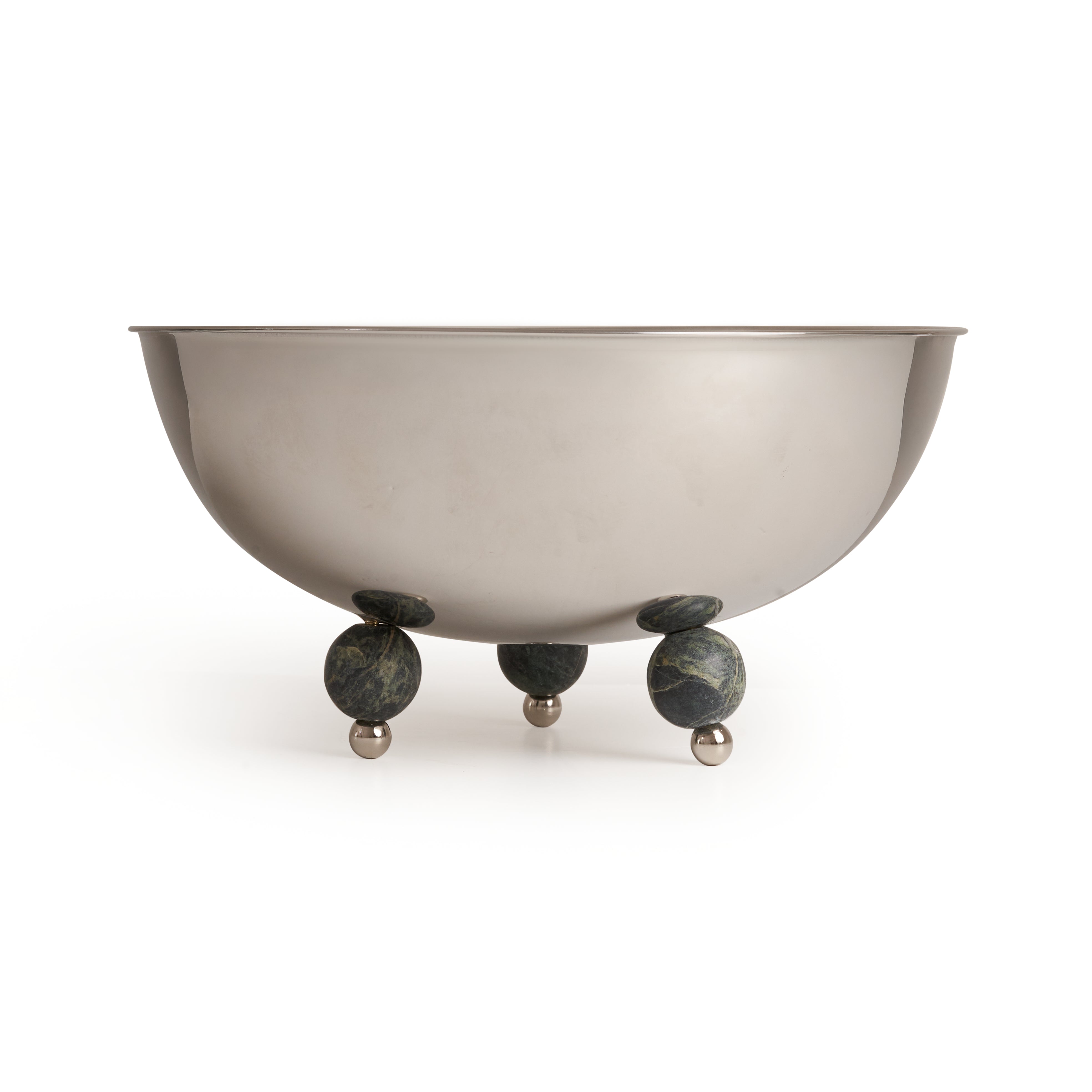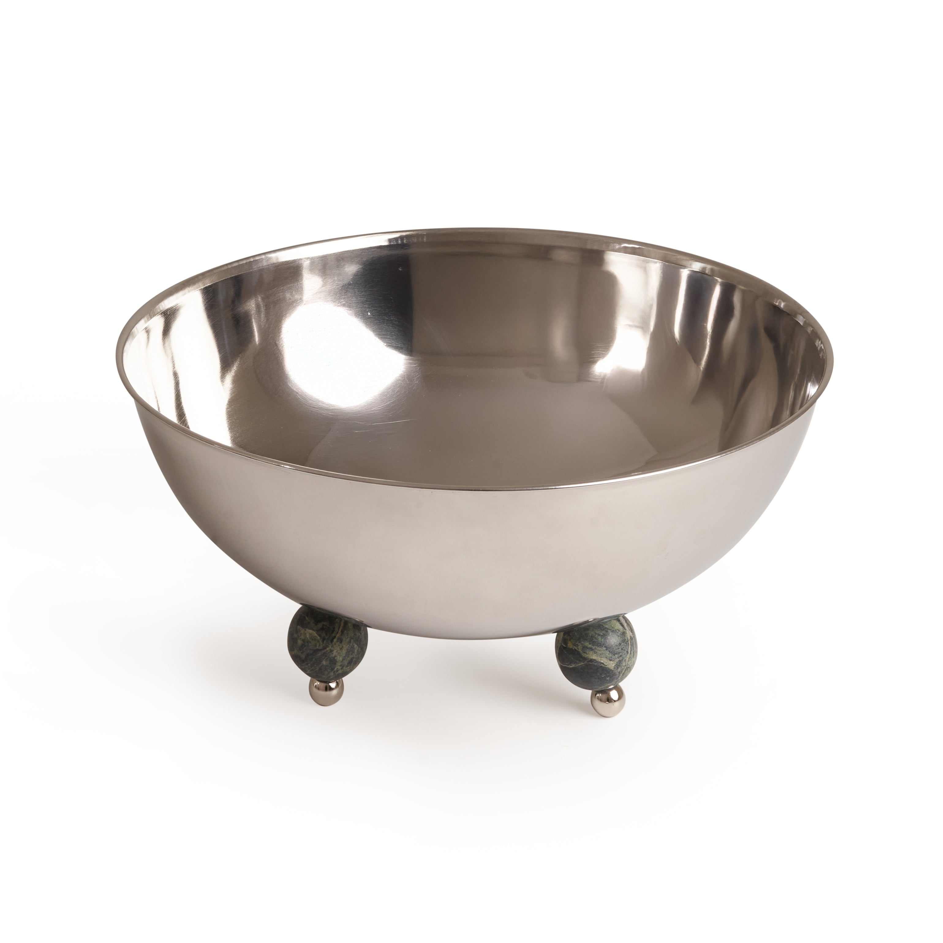 A statement of modern elegance, the SilverStone Serving Bowl combines a sleek stainless steel body with sculptural marble sphere details, delicately elevated on plated brass accents. The contrast of polished steel, natural stone, and subtle metallic touches creates a refined balance of texture and shine.