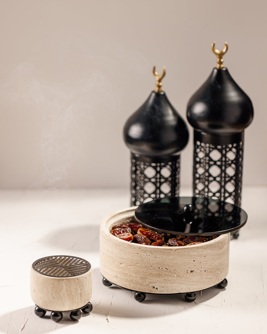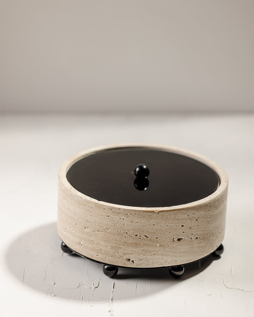 This Travertine Marble Box with Black Glass Cover combines the natural elegance of marble with a sleek, modern touch. The sturdy marble base is beautifully complemented by the sophisticated black glass cover, making it perfect for serving nuts or nibbles while also being a decorative piece for any space.