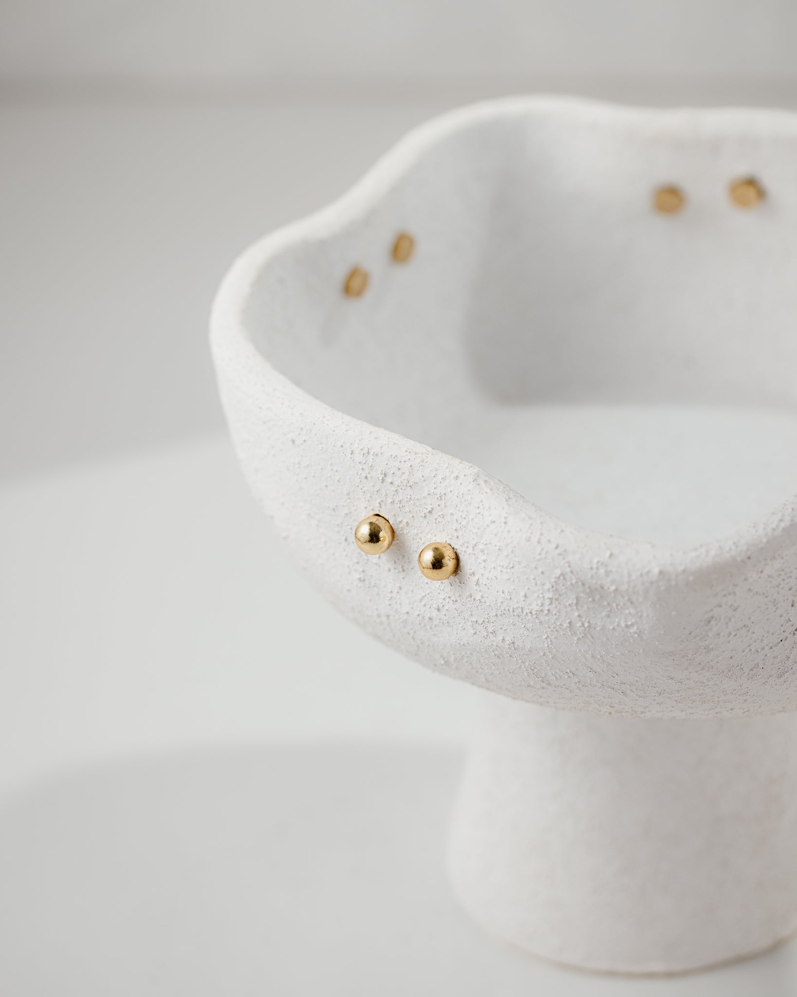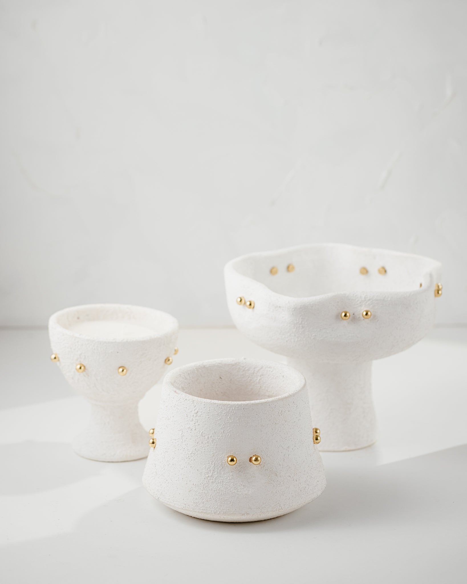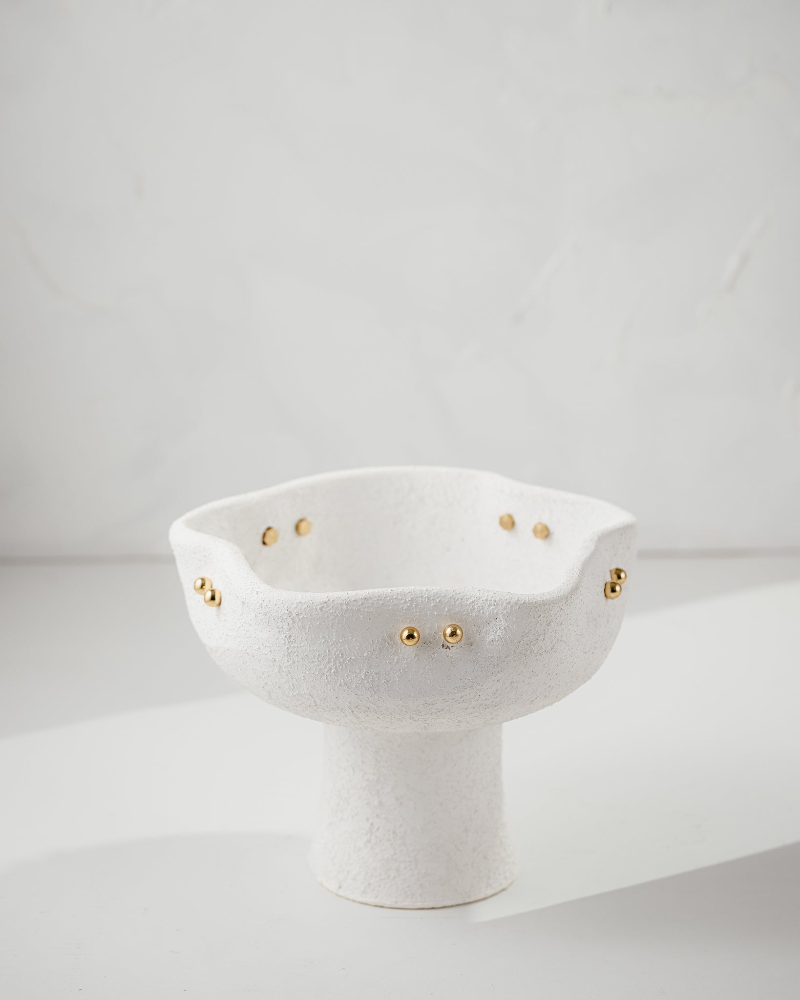 This large Pedestal Bowl features an abstract, earthy design with graceful, flowing curves that evoke the calming movement of natural elements. The smooth lines are complemented by elegant gold-plated brass pins, adding a refined touch of sophistication.