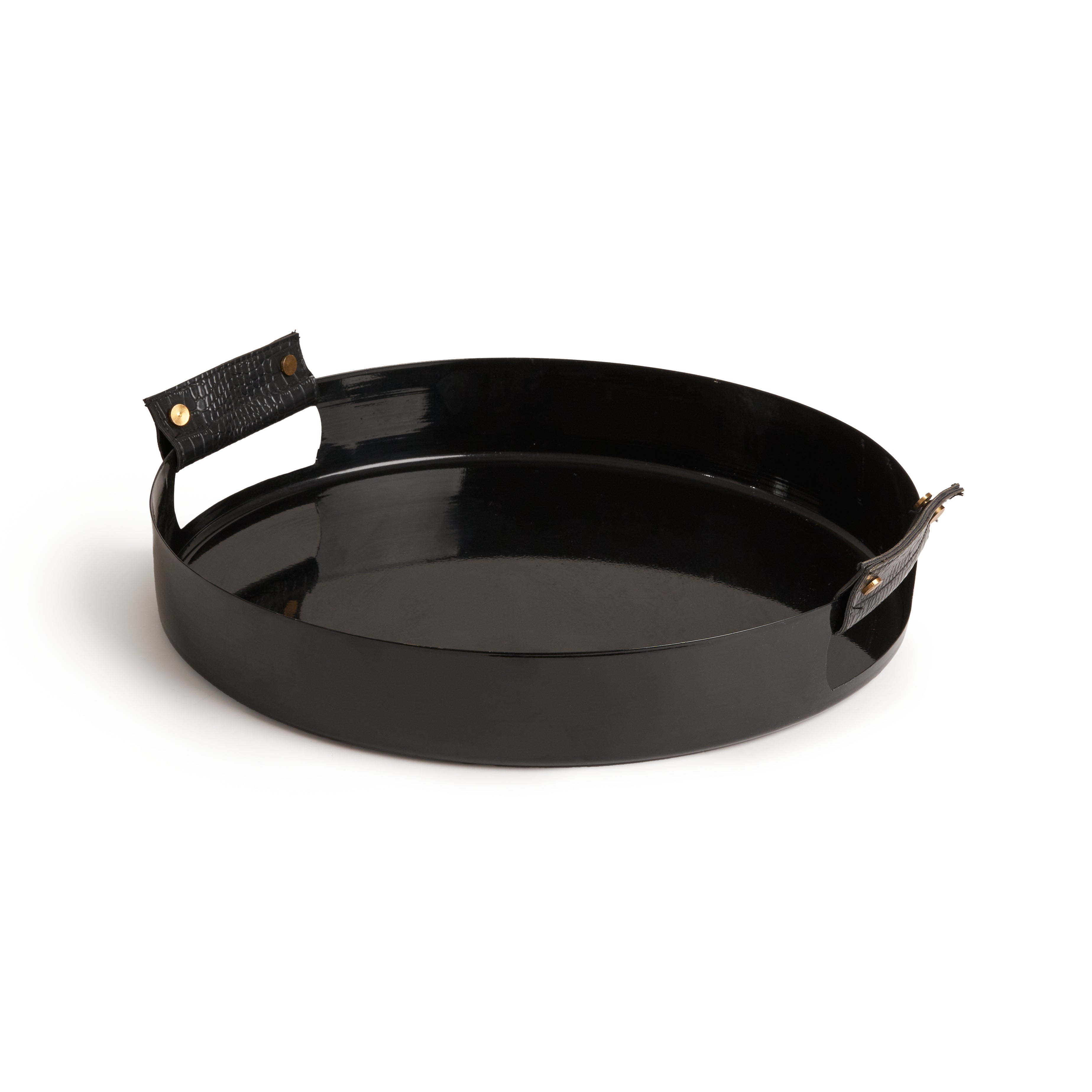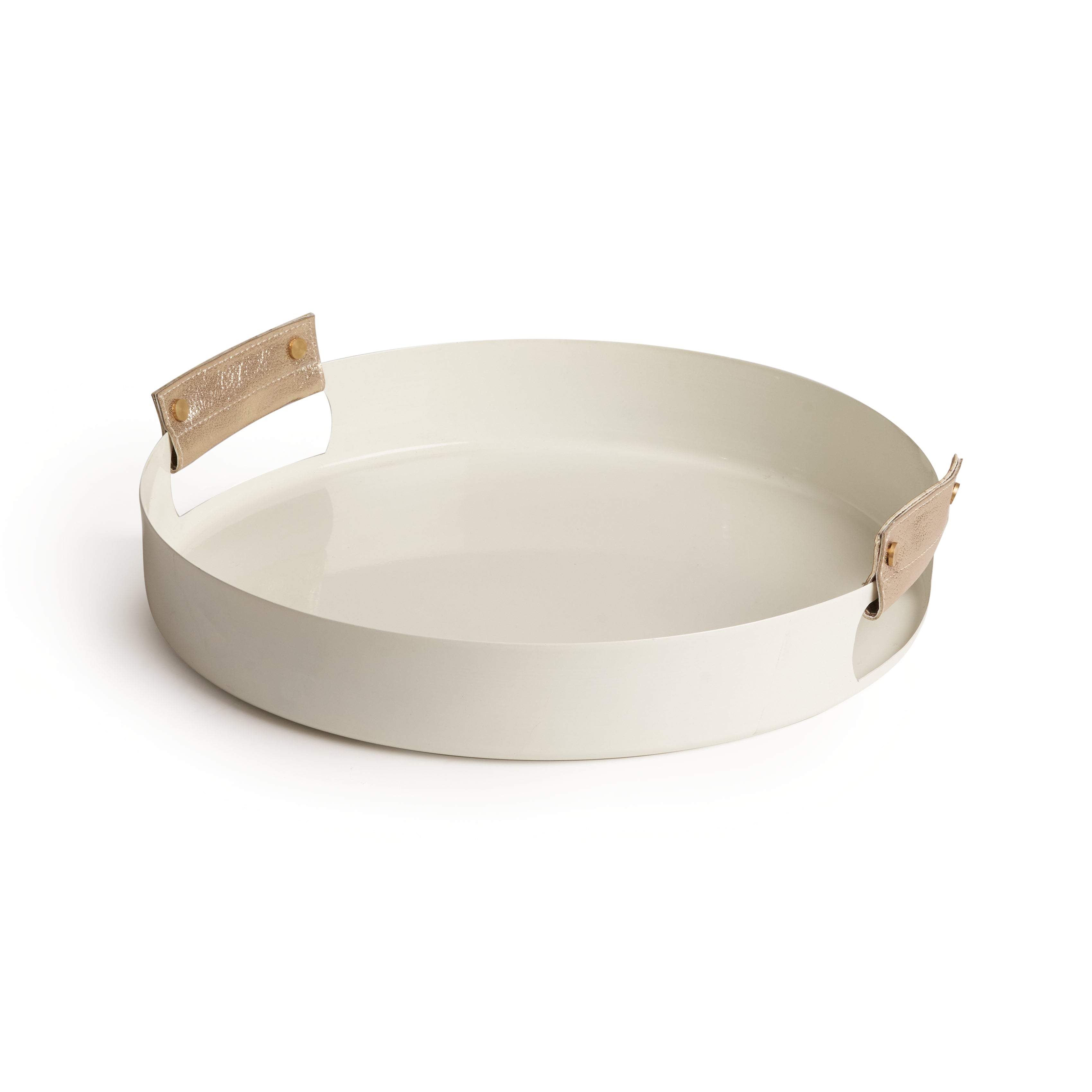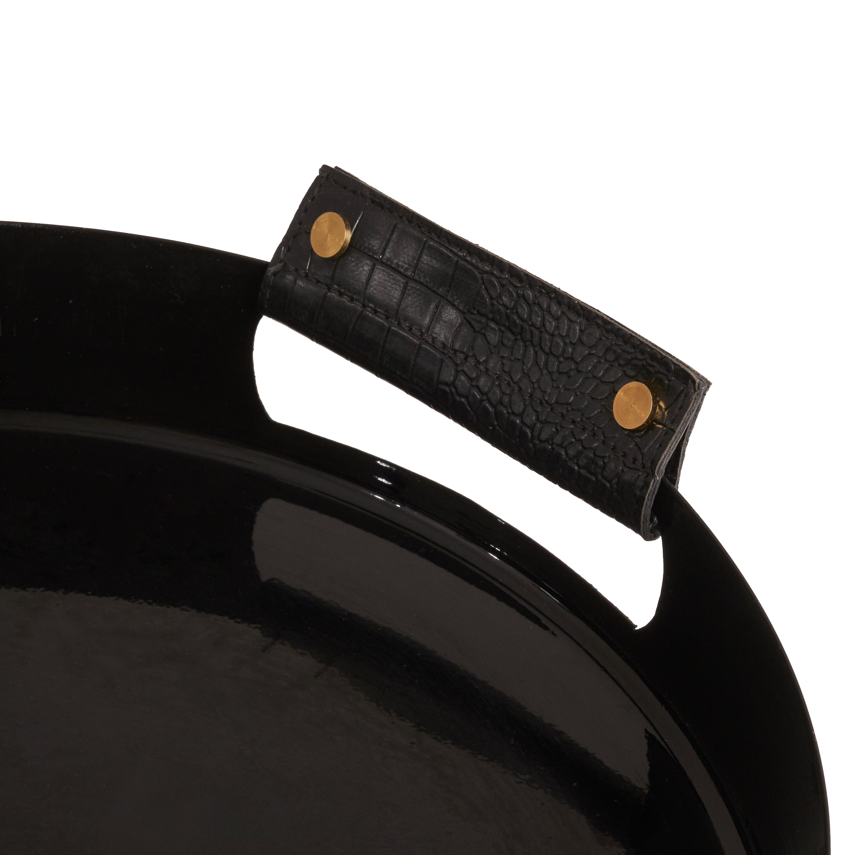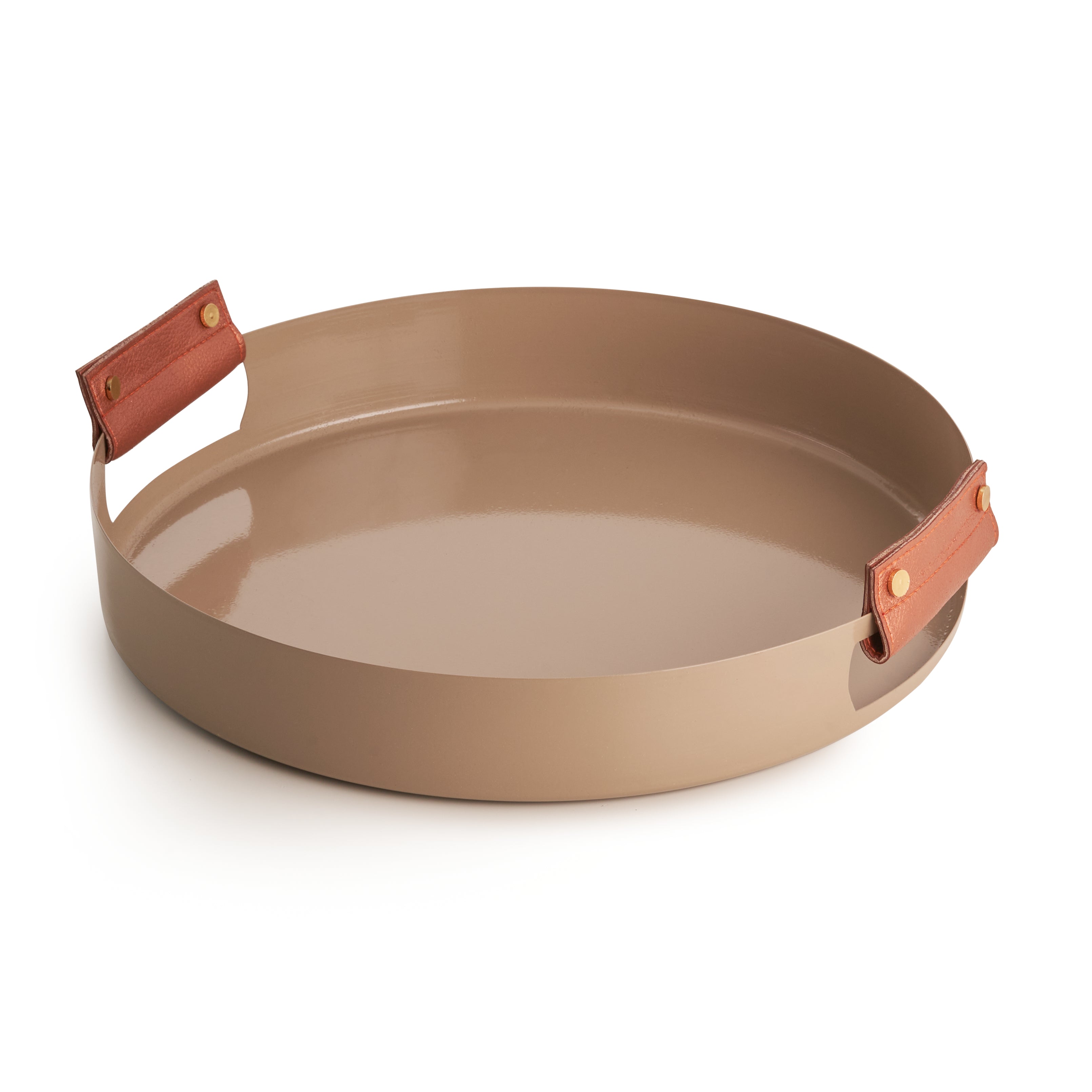 Elevate your space with the elegant Halo Tray — a round metal tray designed with both style and function in mind. Featuring premium leather handles and accented with brass gold-plated pins, this tray brings a touch of sophistication to any setting. Perfect for serving or decor.