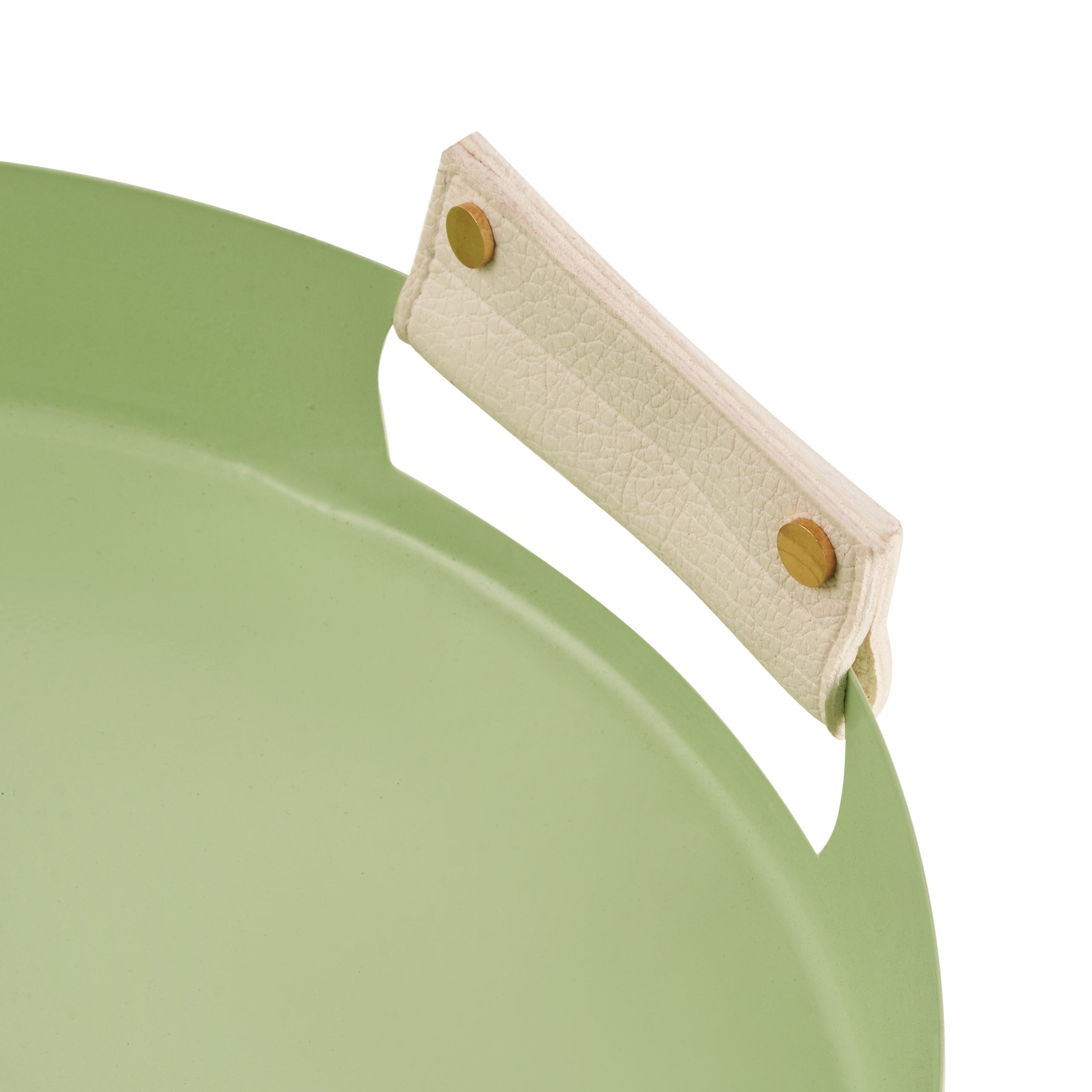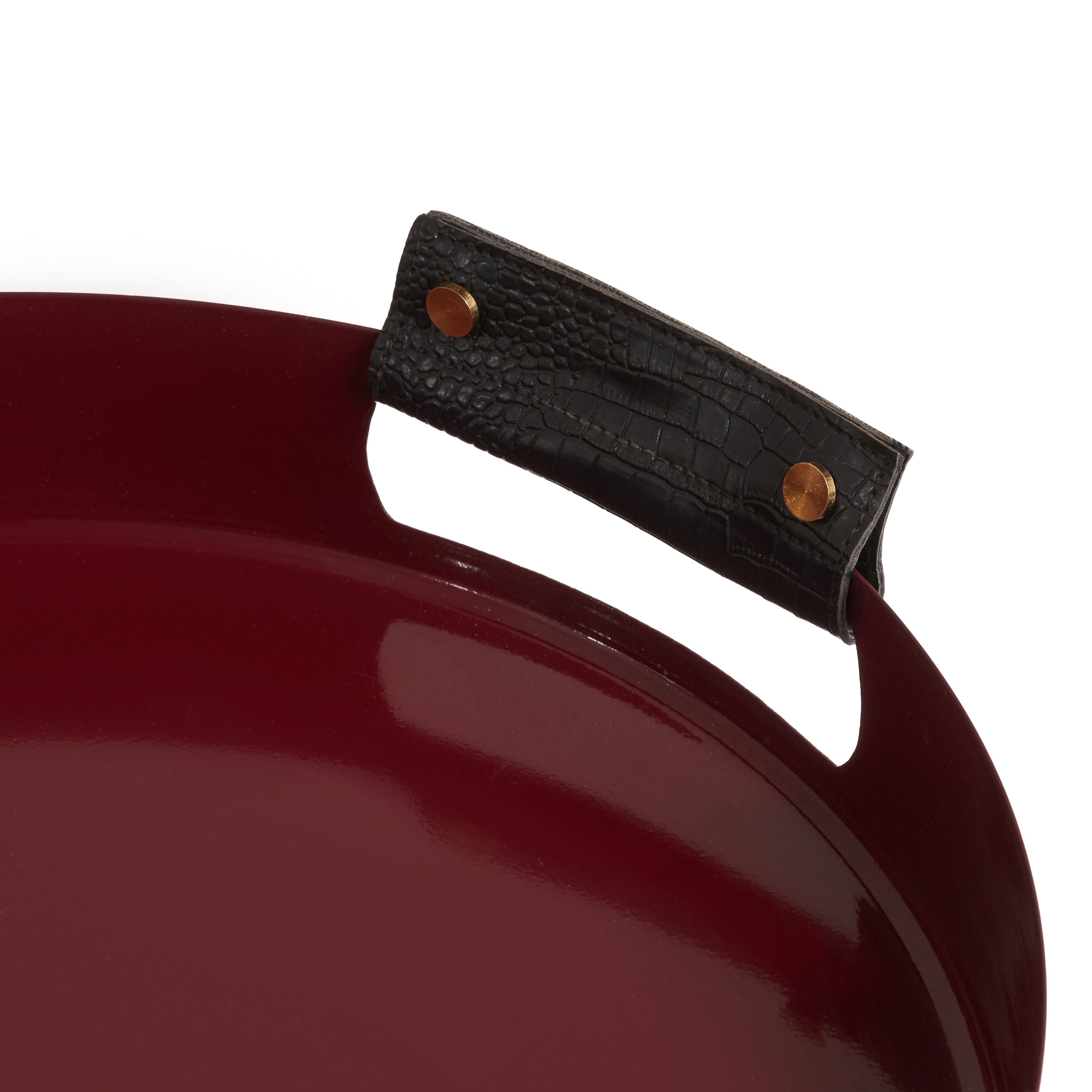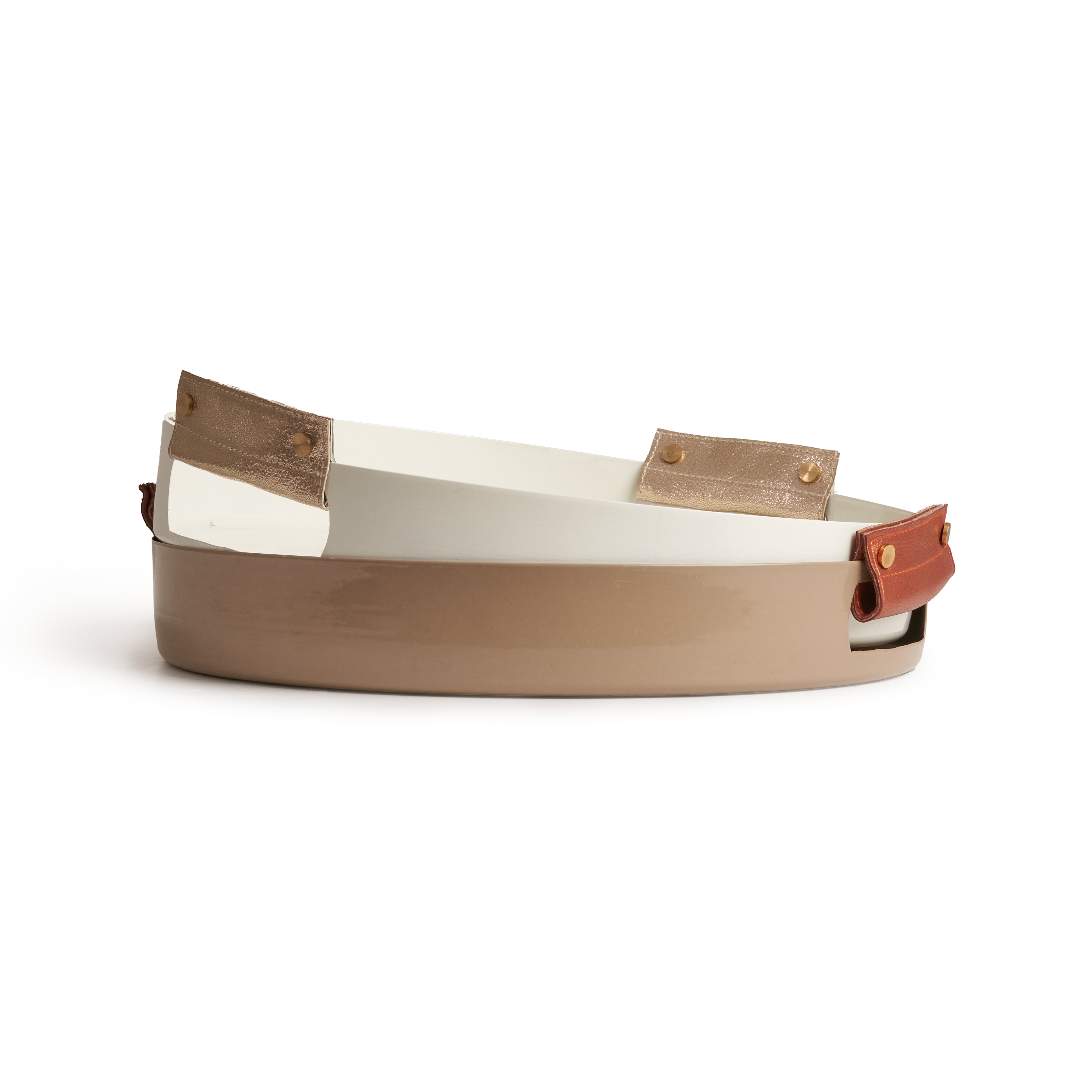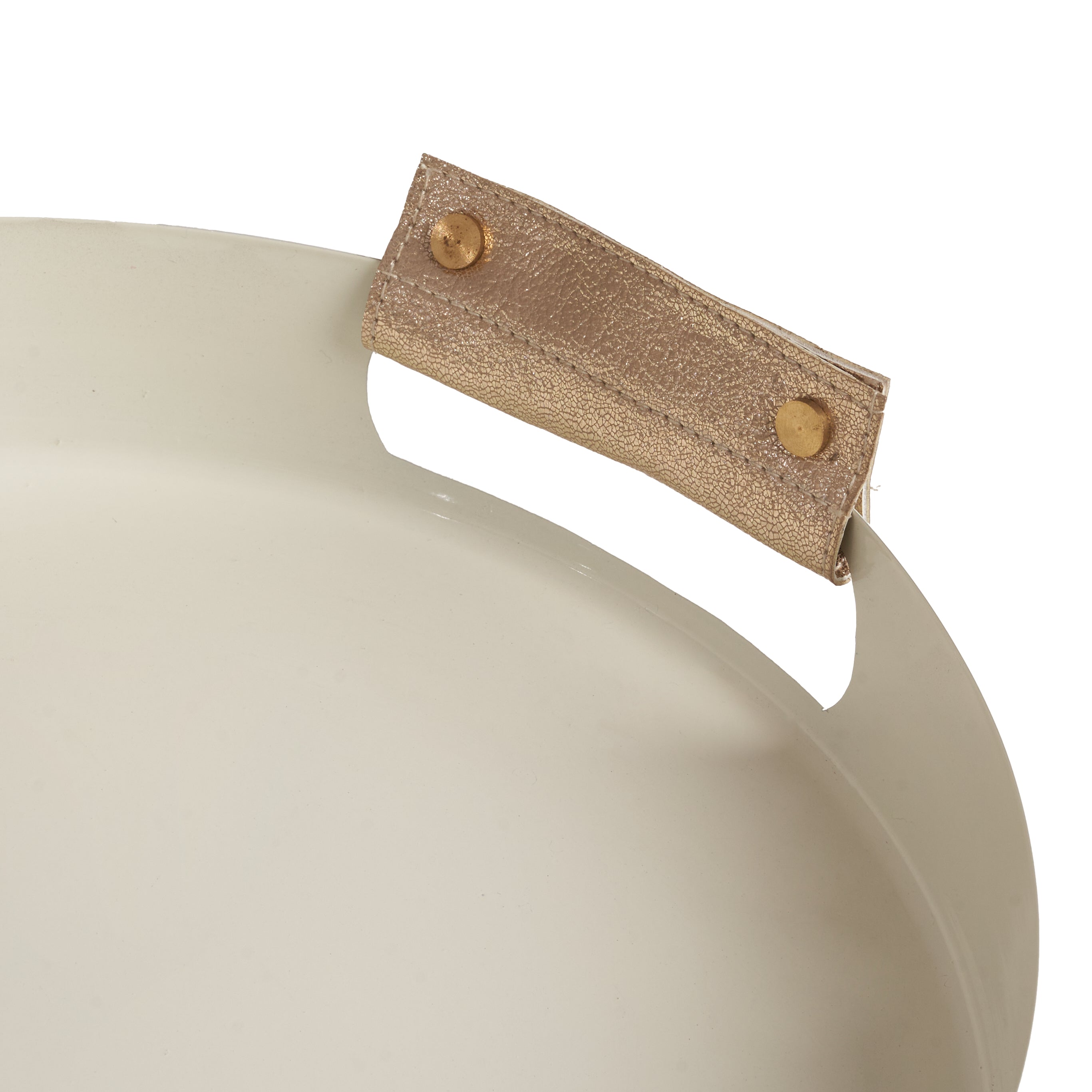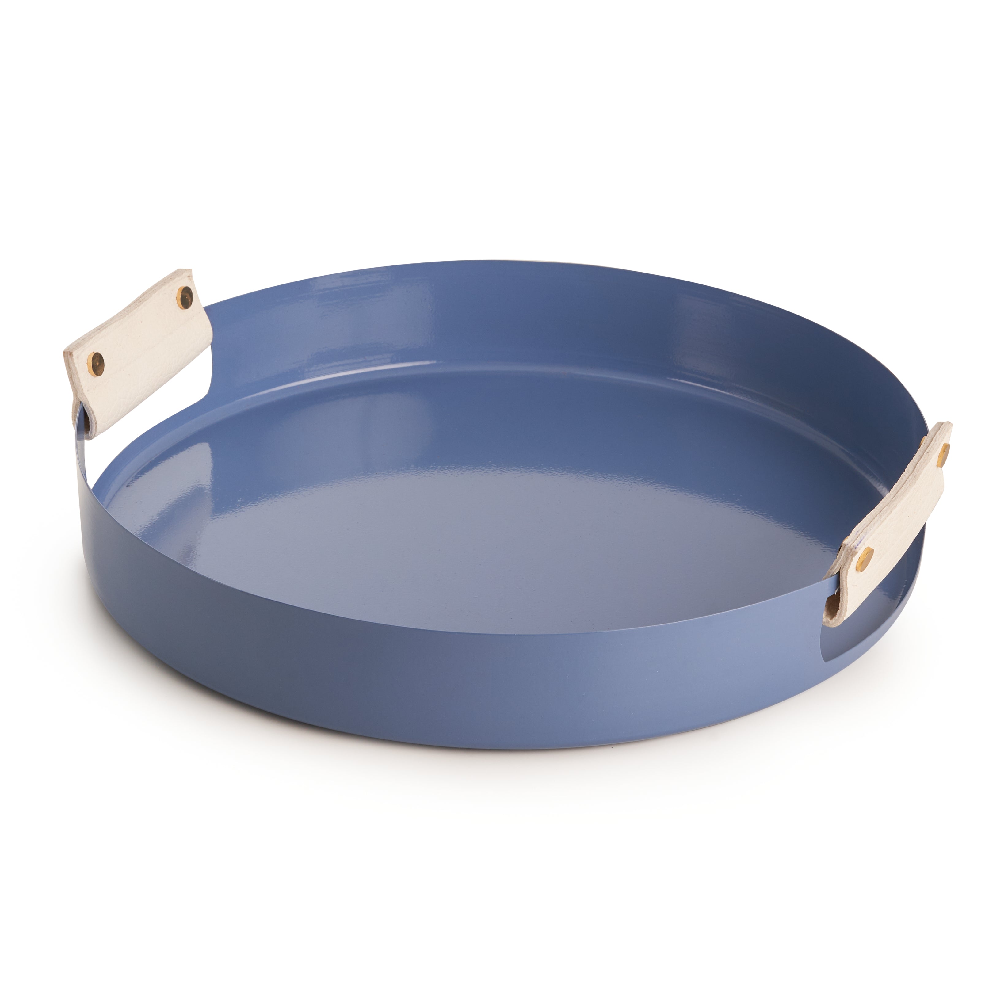 Elevate your space with the elegant Halo Tray — a round metal tray designed with both style and function in mind. Featuring premium leather handles and accented with brass gold-plated pins, this tray brings a touch of sophistication to any setting. Perfect for serving or decor.