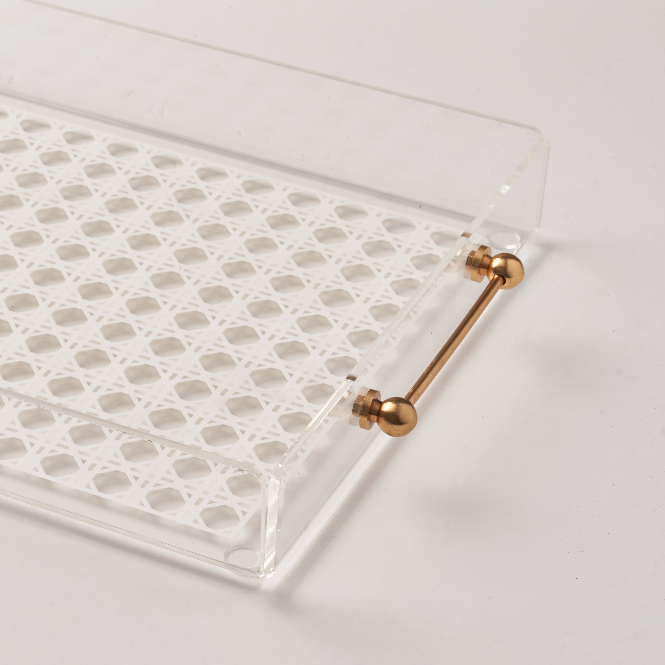Refined and effortlessly elegant, the White Cane Tray is crafted from clear acrylic and features a delicate cane-inspired pattern that adds texture and warmth to its modern design. Finished with sleek gold-tone handles, it brings a subtle touch of luxury while remaining light, versatile, and timeless.