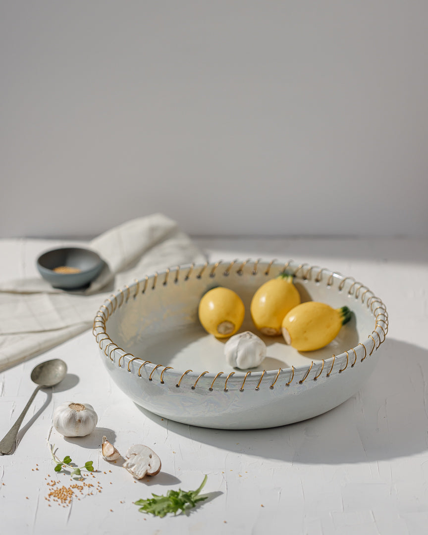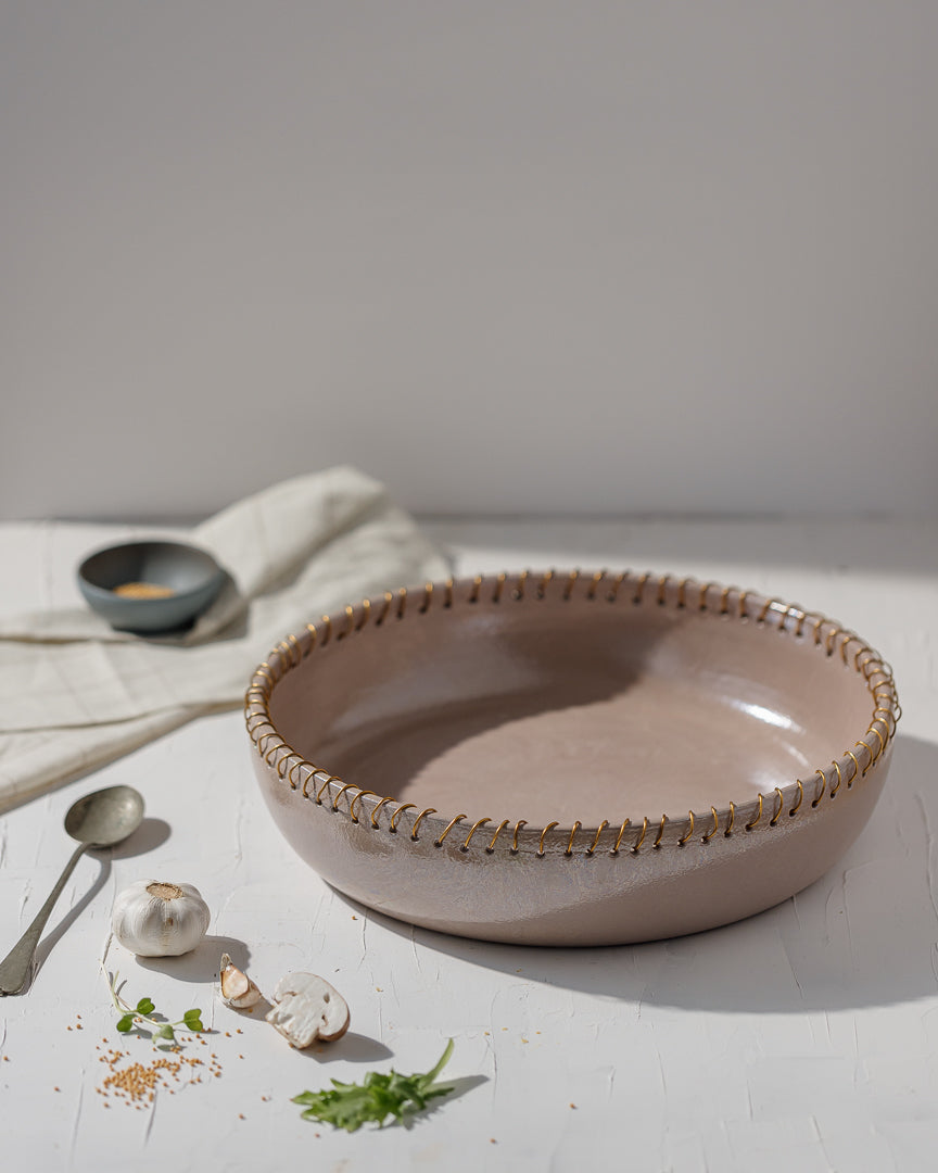 This Round Pot, adorned with a stunning spiral gold-plated brass wire, is a testament to timeless craftsmanship and design. The harmonious blend of earthy pottery and radiant brass creates a captivating contrast, making it both functional and decorative. Handcrafted to perfection, this statement piece adds elegance and charm to any setting, seamlessly blending art and utility.