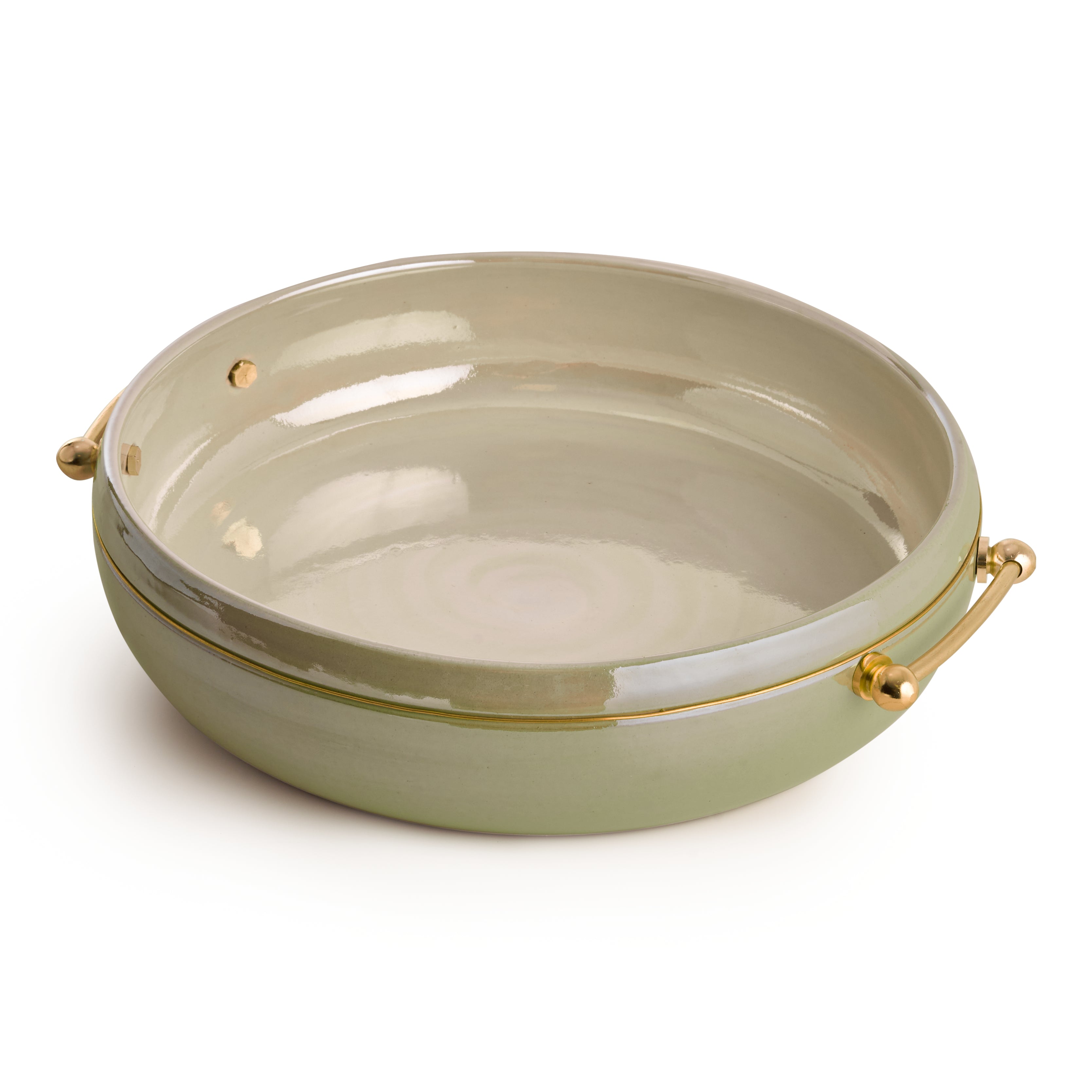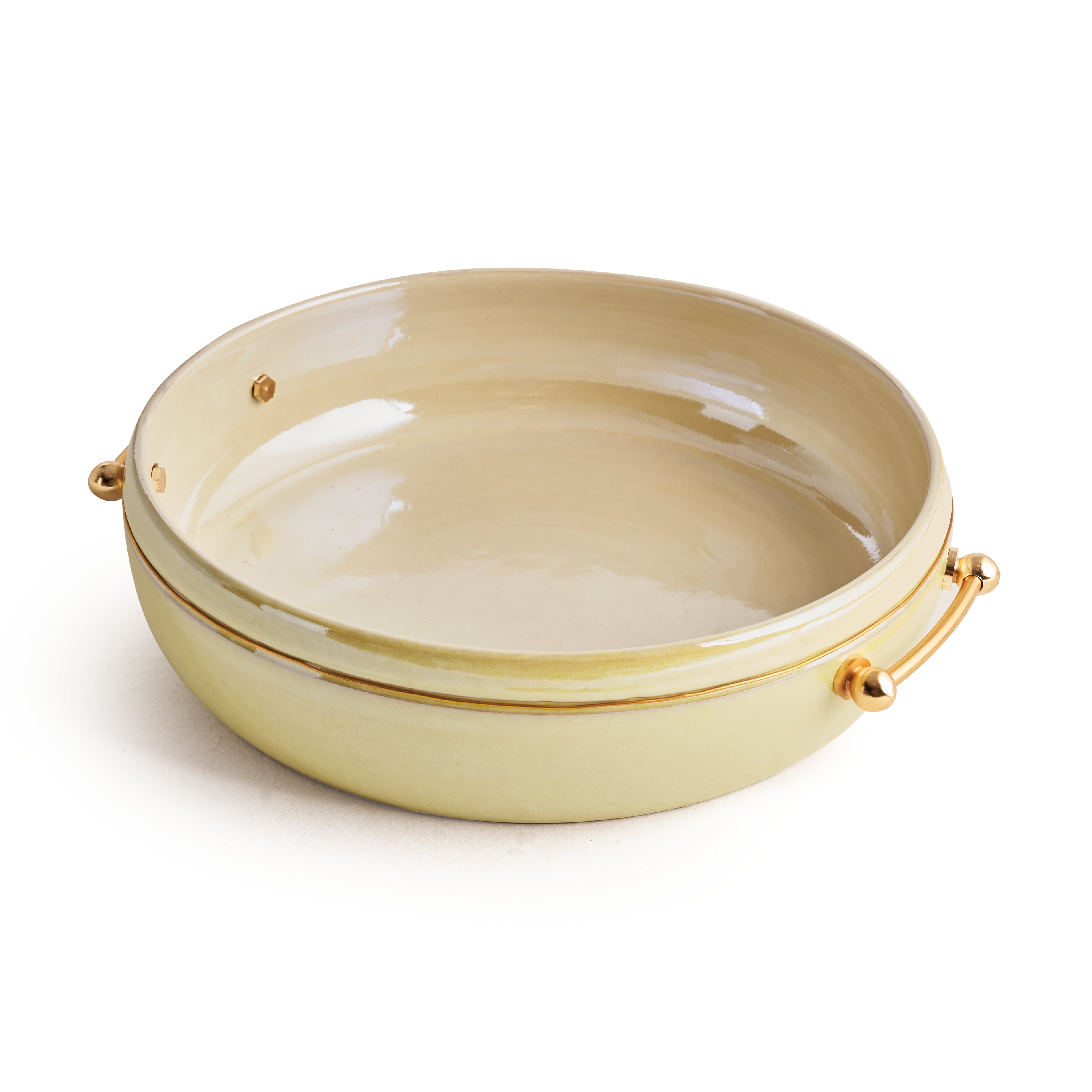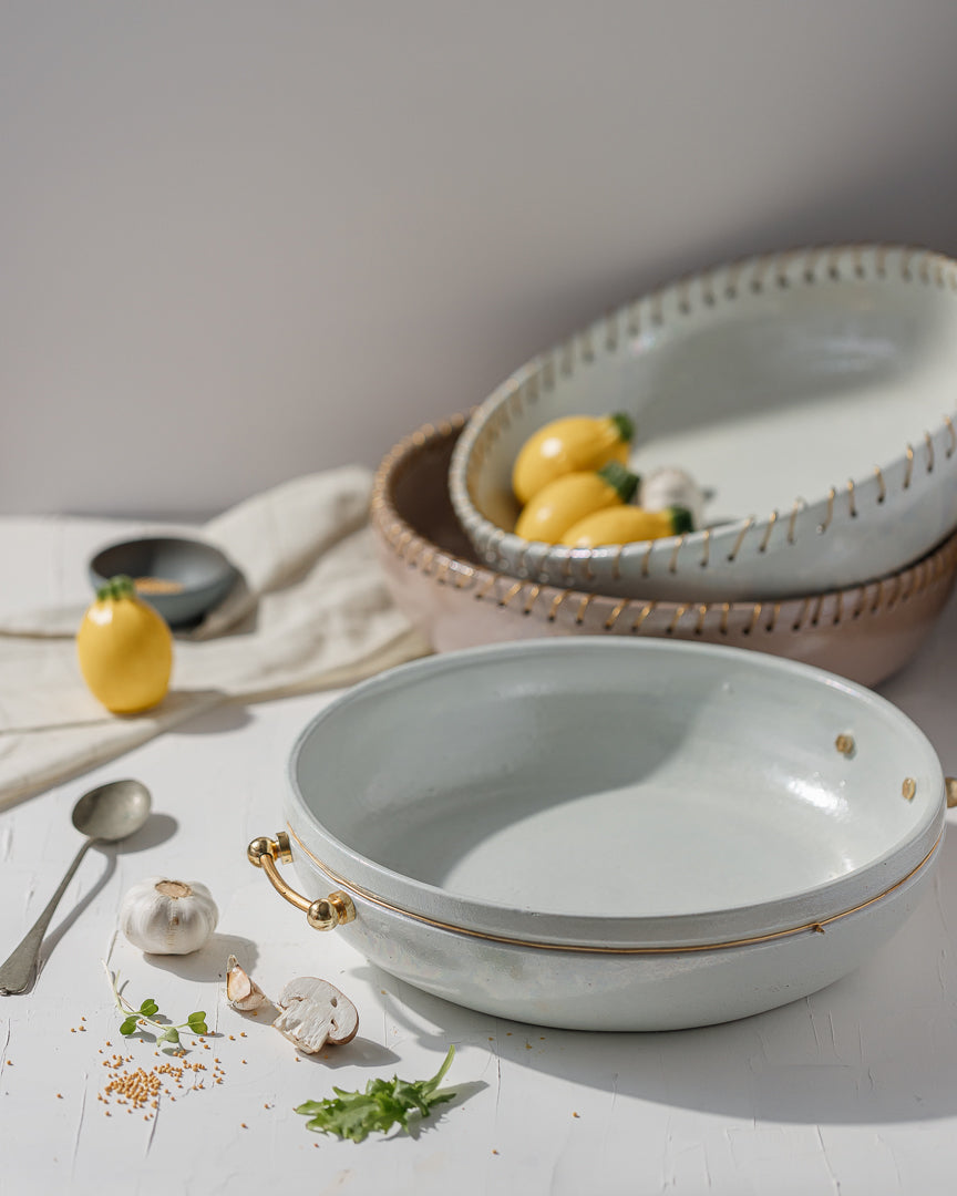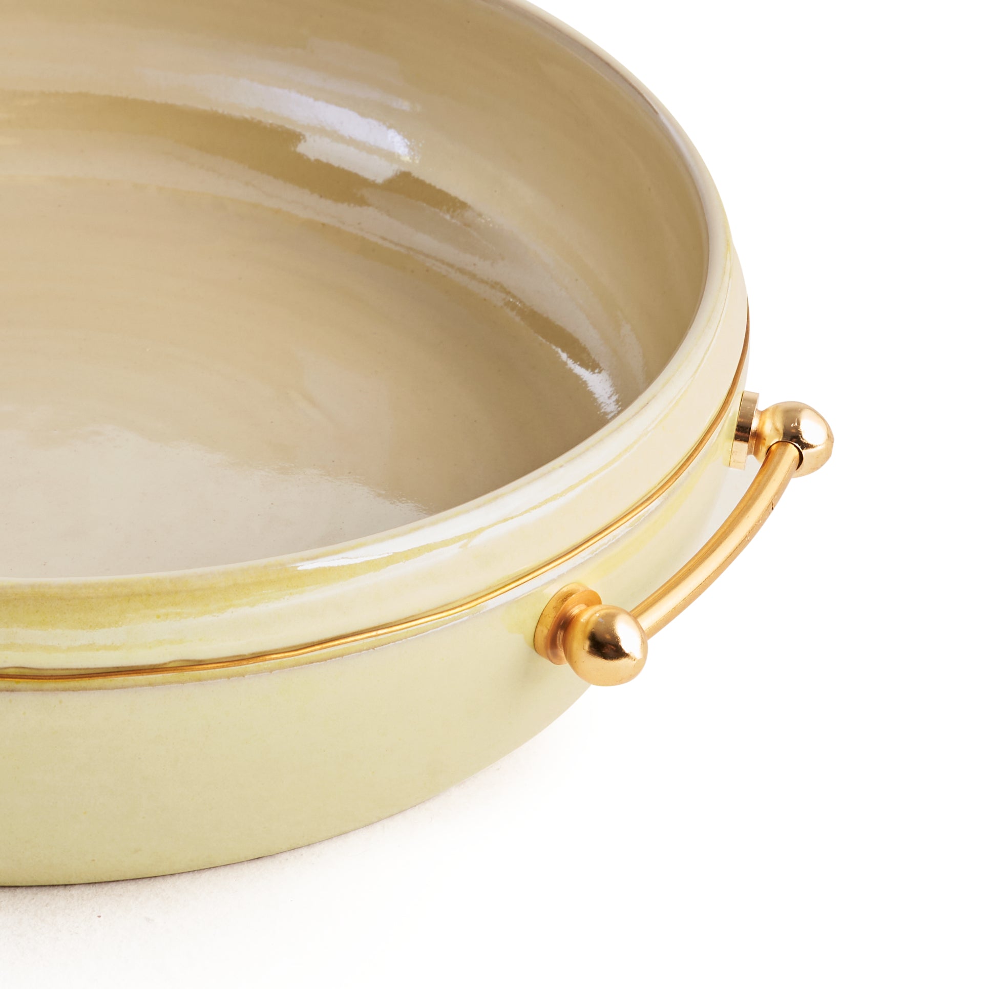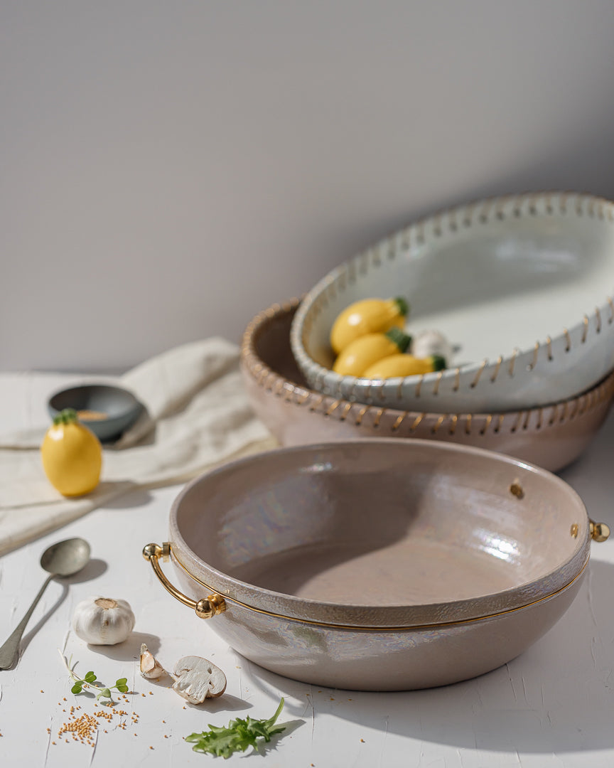 Elevate your dining experience with this exquisite Serving Pottery Plate, designed to bring both elegance and functionality to your table. Crafted from high-quality, durable pottery, this plate features a smooth, glazed finish that exudes a timeless charm. The standout feature is the luxurious gold brass handles. Whether you're presenting a special dish or enjoying a casual meal, this serving plate brings sophistication to every occasion. Perfect for both everyday use and special gatherings, it's a piece that seamlessly blends artistry with practicality.
