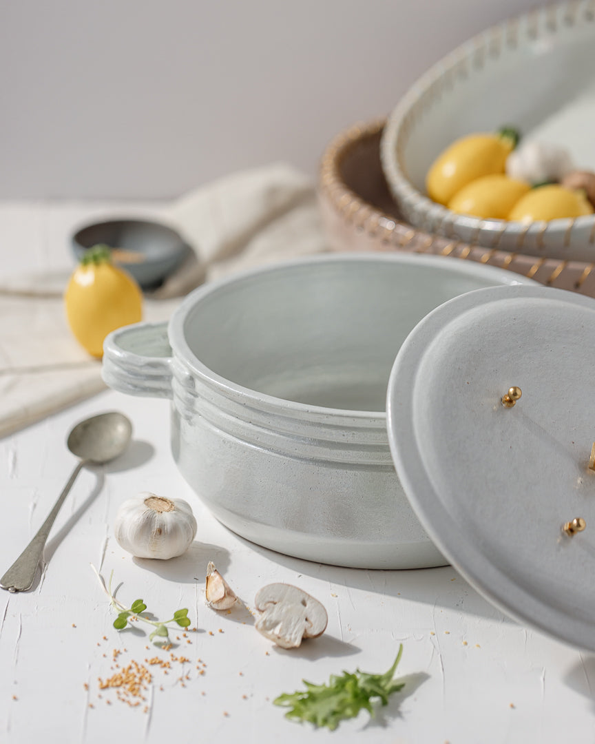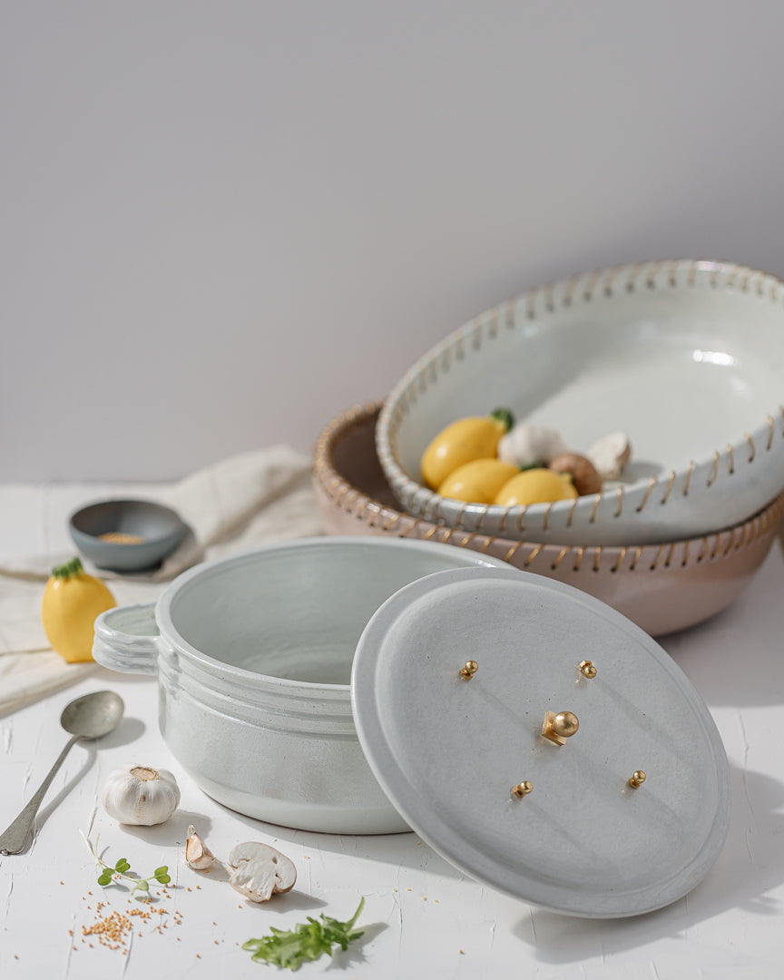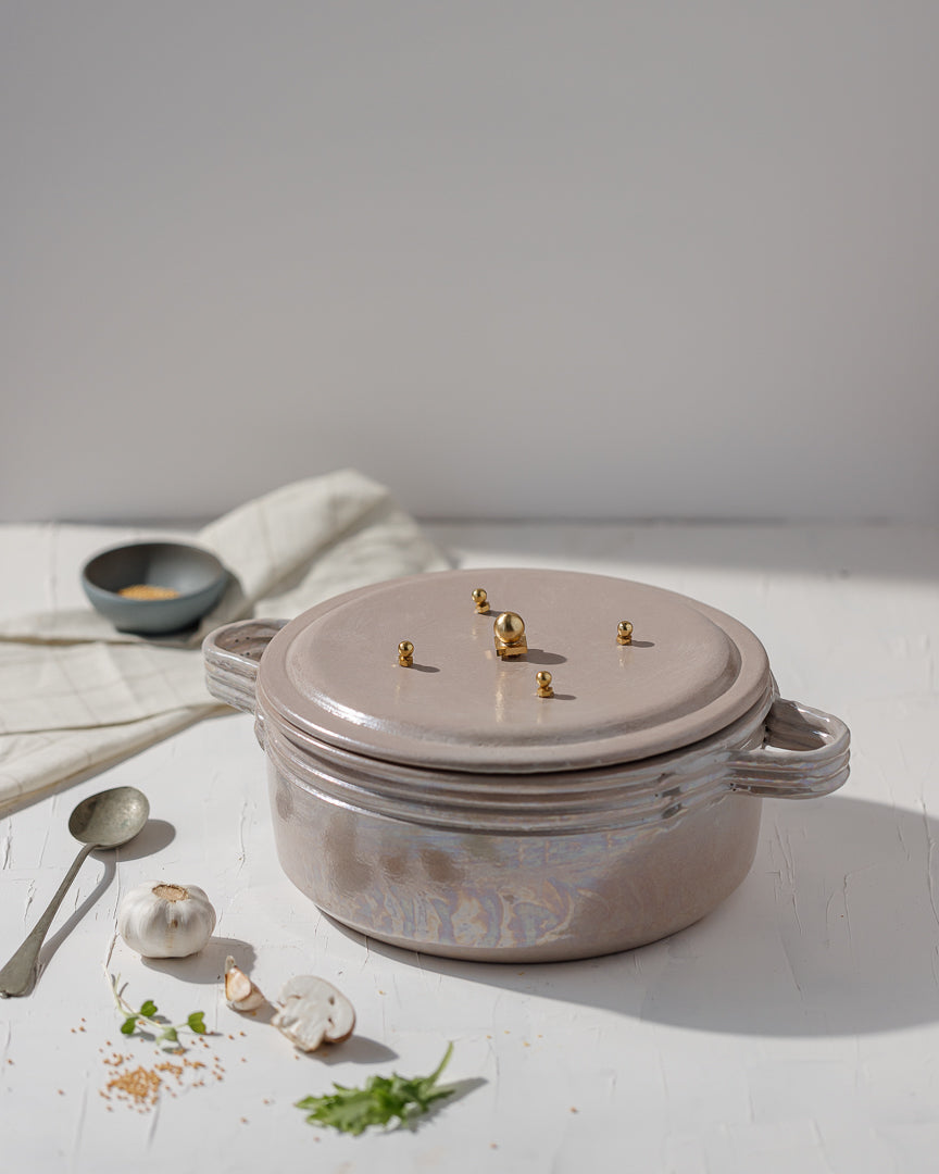 <p>This elegant <strong>Serving Pottery Pot</strong> combines rustic charm with refined craftsmanship. Featuring a beautifully crafted pottery lid adorned with gold-plated brass pins on top, it adds a sophisticated touch to any table setting. Perfect for serving stews, soups, or sides, this pot is both functional and decorative, making it an ideal centerpiece for any meal or gathering.</p>