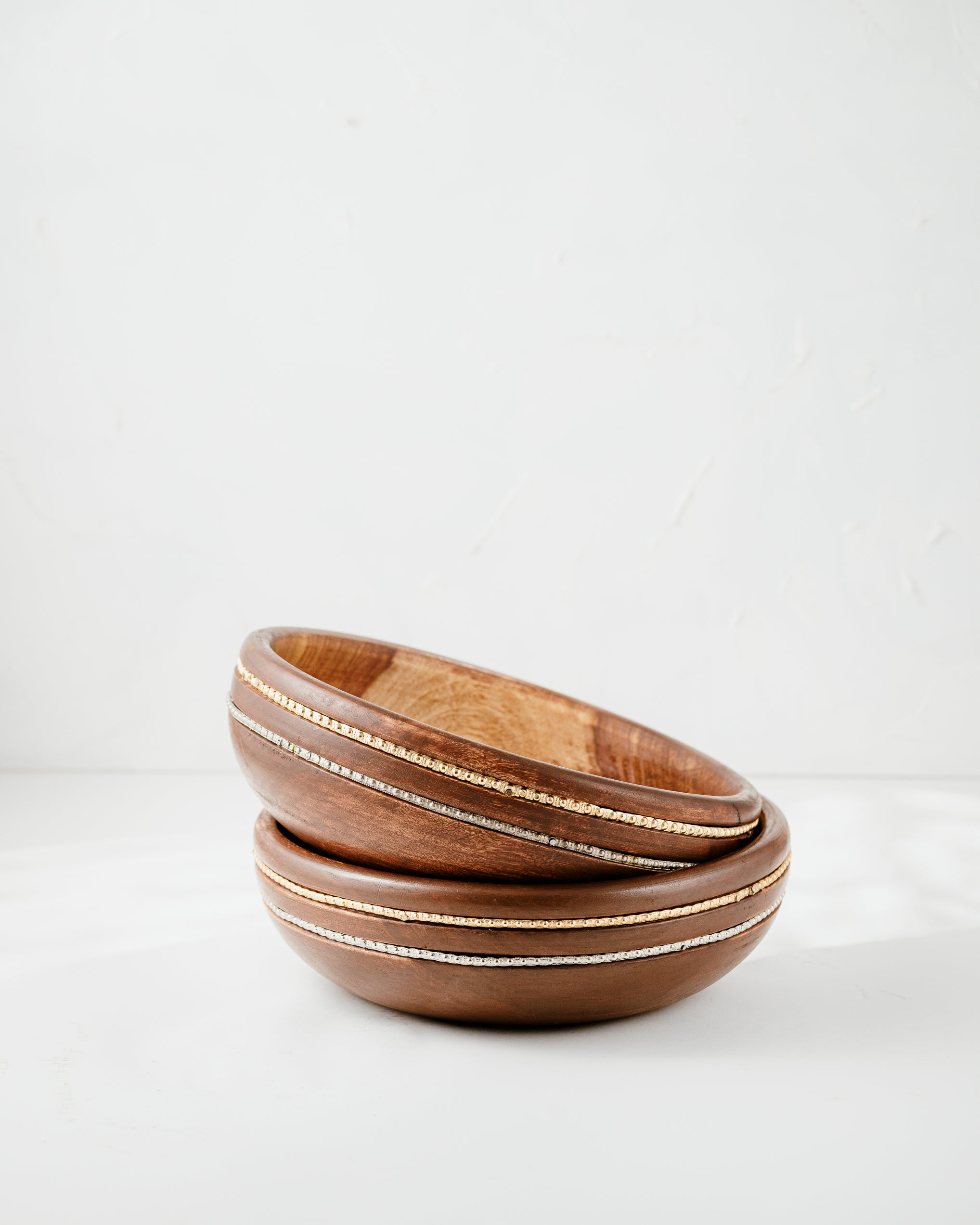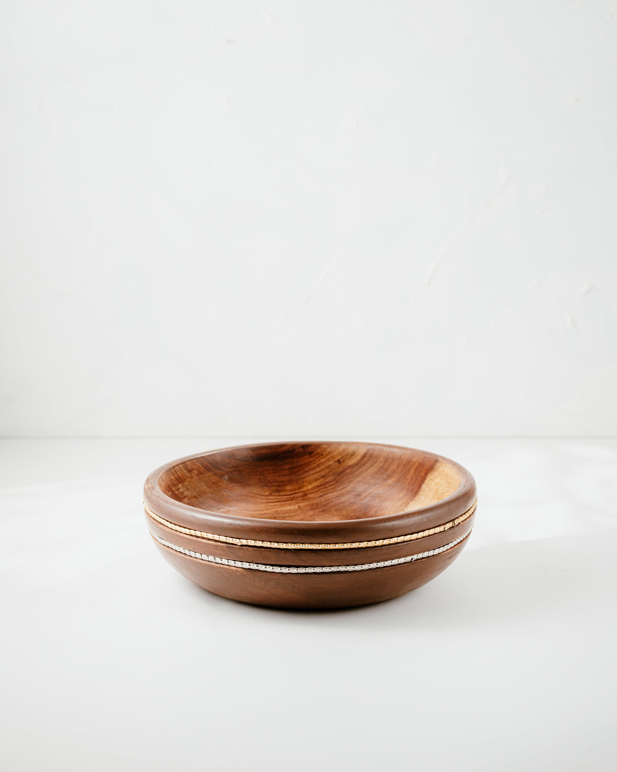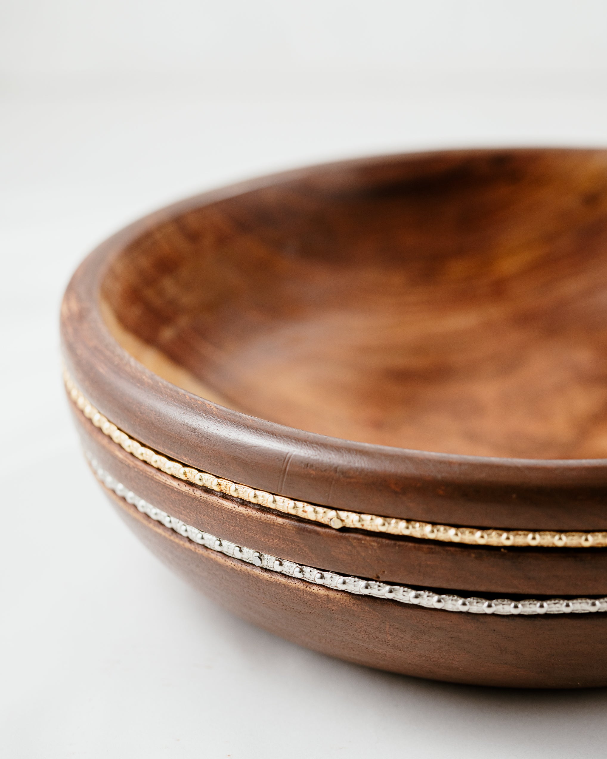 This handcrafted Wood Bowl is beautifully adorned with intricate gold and silver details, blending natural warmth with luxurious accents. Its timeless design makes it a stunning centerpiece, perfect for serving or display. Both functional and decorative, it adds elegance and character to any space.